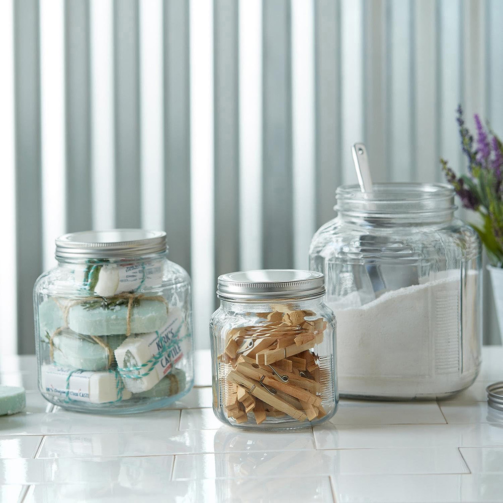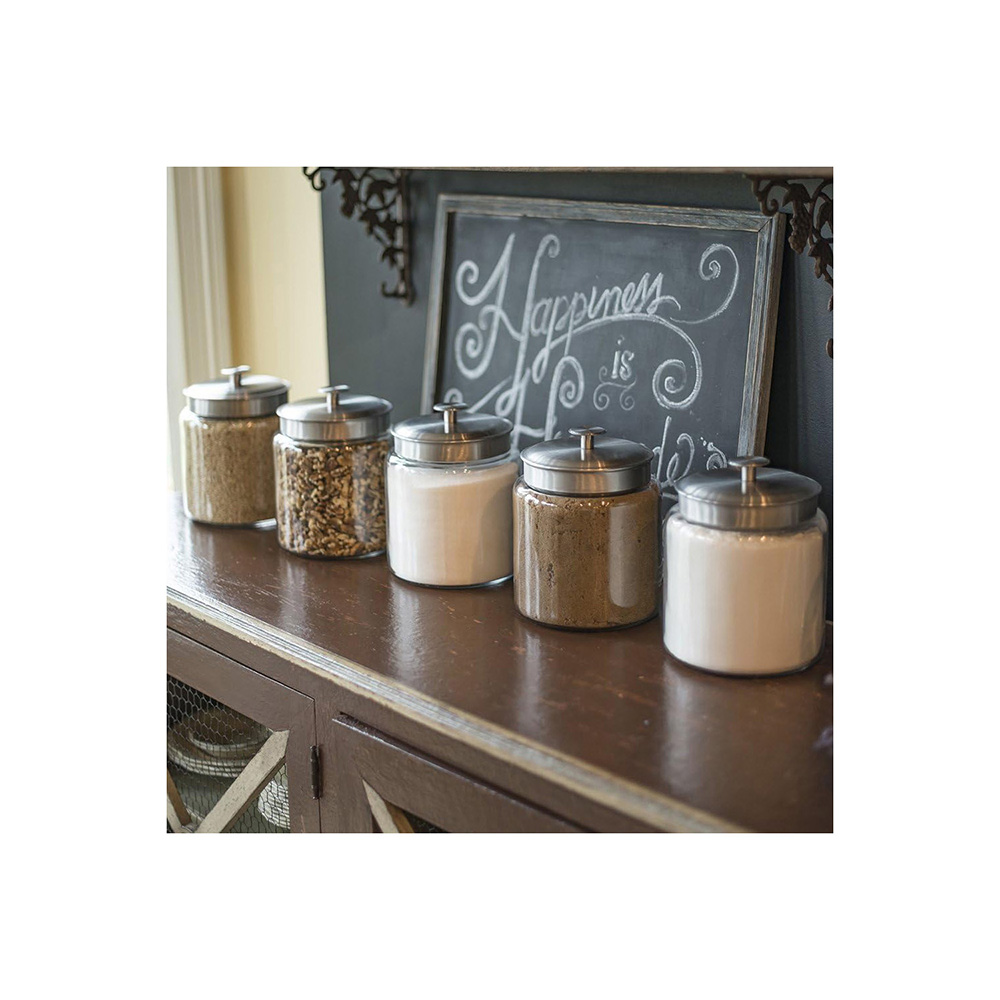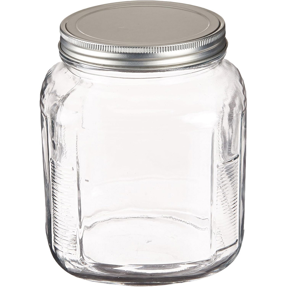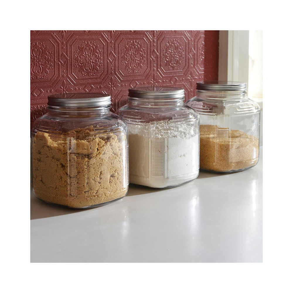 This Anchor Hocking 3-piece Cracker Jar set contains: (1) 32-ounce, (1) 2-quart and (1) 1-gallon glass cracker jars. Genuine Anchor Glass design features thick side walls for added durability and stability. Glass jar is dishwasher safe; hand-washing is recommended for the brushed metal lid. Great for storing dry goods in the kitchen or for other household storage needs. This set is perfect for registries, new homeowners and holidays. Anchor Glass is MADE IN THE USA.