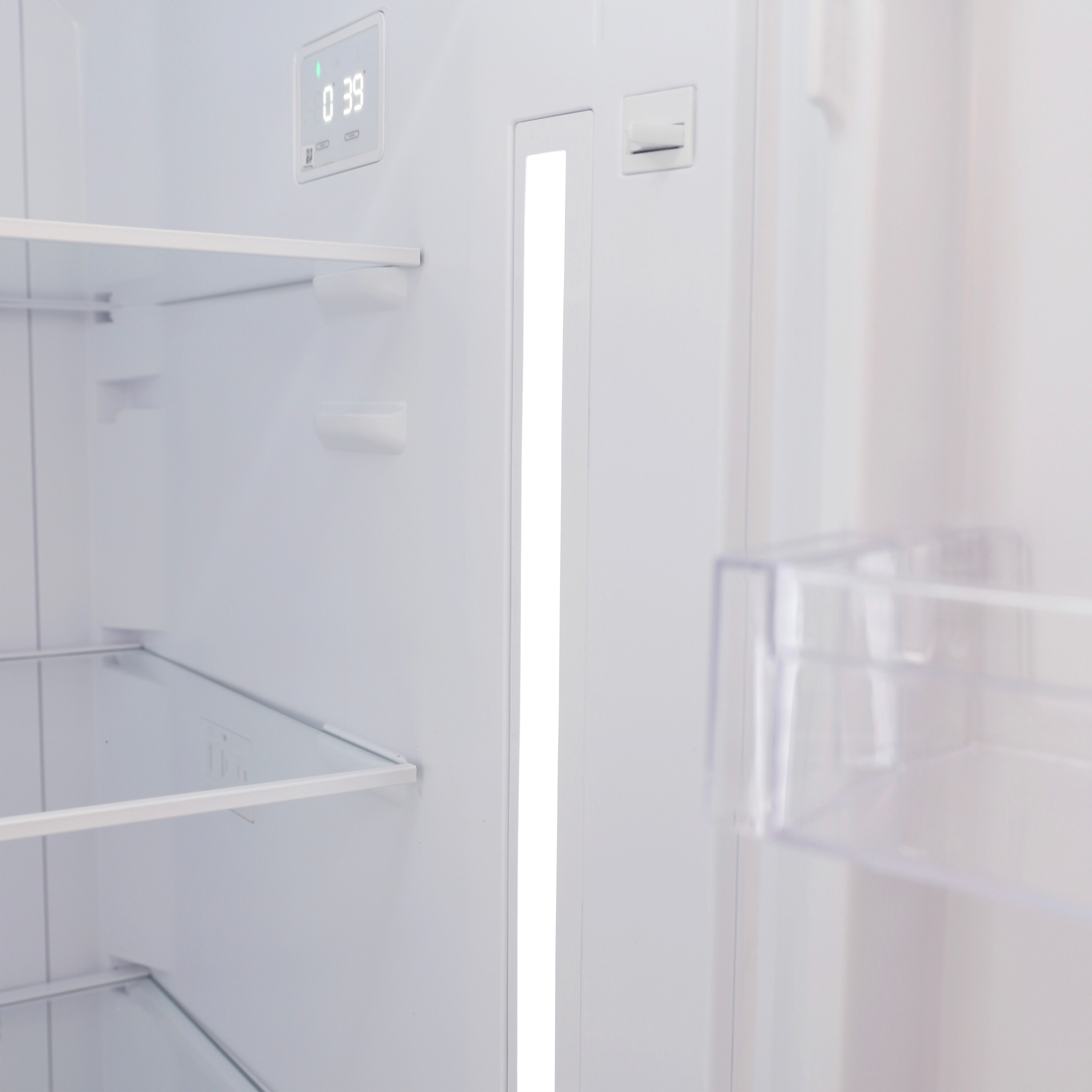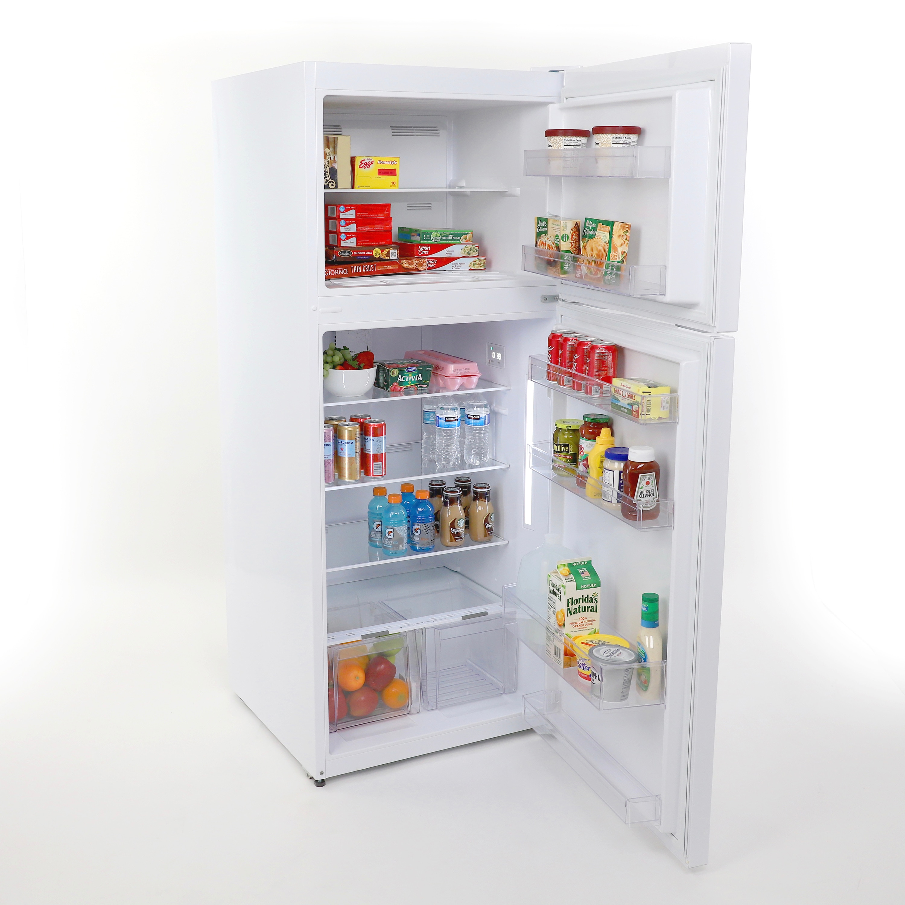 Store your favorite food and beverages in this 11.6 cubic feet, white refrigerator from Avanti. The perfect apartment size refrigerator, your food, and beverages stay fresh and cold thanks to the frost free defrost system. The top mounted freezer section is the ideal solution when it comes to saving money and storing frozen food in bulk. The full width door bins make storing beverages easy and can accommodate 2 liter and gallon bottles. The adjustable glass shelves and two clear view storage crispers with a glass lid allow you to arrange salads, fruits, snacks, and other food for easy access throughout the day. Select the right settings for your items with the adjustable temperature control.