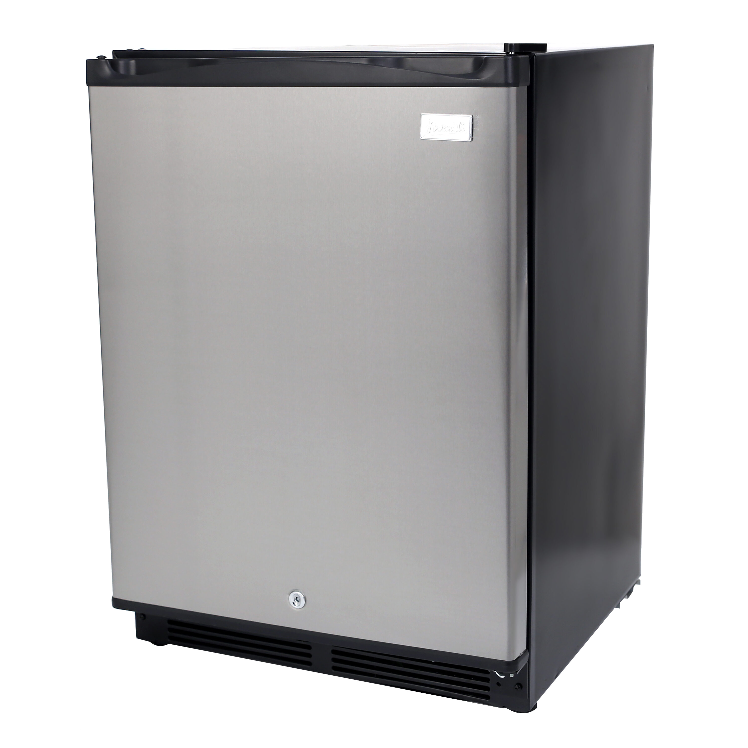 Keep your snacks and favorite beverages close by in the compact, 5.2 cubic foot black refrigerator with a stainless steel door from Avanti. The perfect lockable mini fridge for the office, dorm, man cave, she shed, bar, bedroom, or anywhere you need a little extra refrigerator space. The door shelves can accommodate 2 liter and gallon bottles, and six 12 ounce cans, as well as other drinks and condiments. Use the adjustable, removable glass shelving to arrange salads, fruits, snacks, and other foods for easy access throughout the day. This compact fridge features automatic defrost so your foods remain fresh and cold. Select the right settings for your items with the full range temperature control.