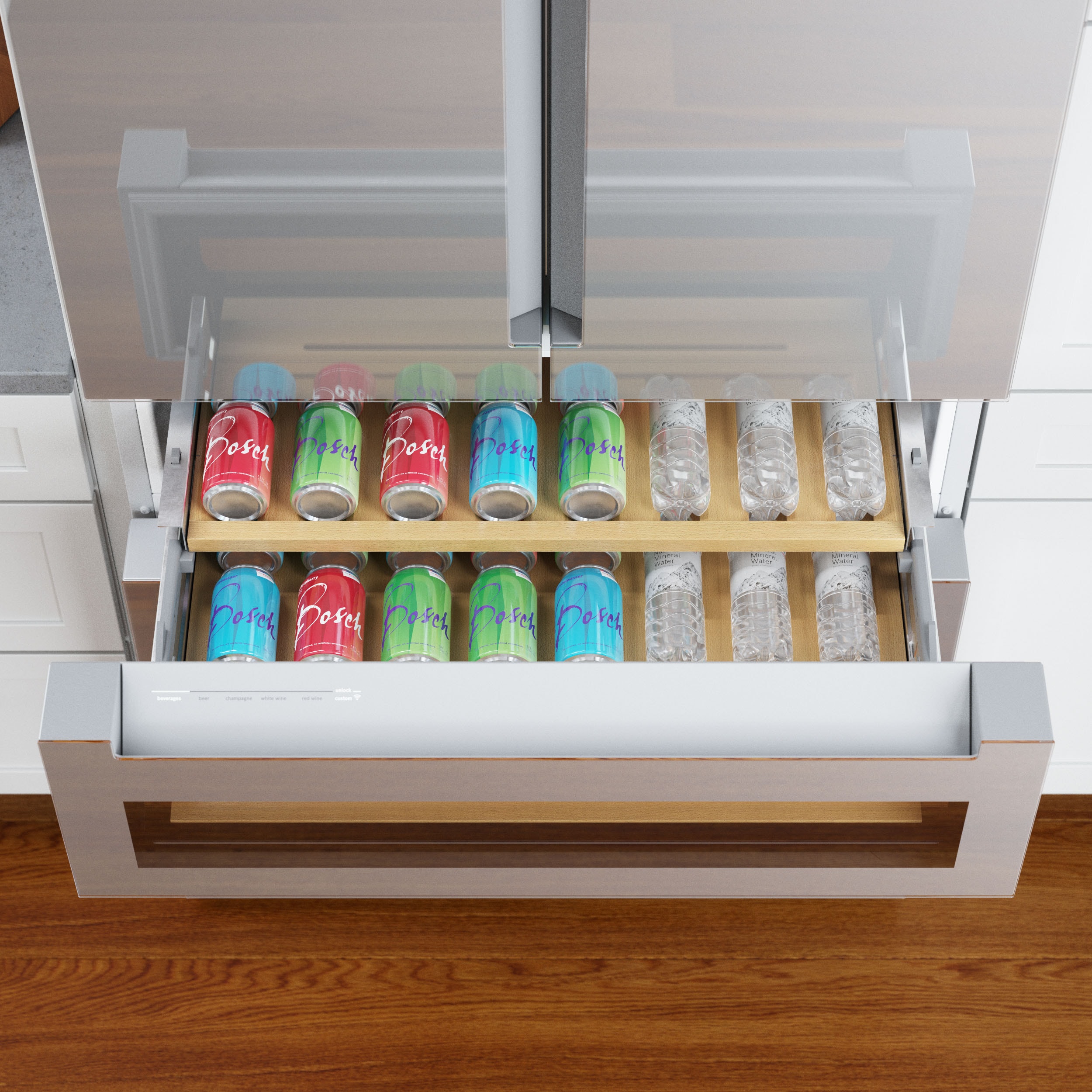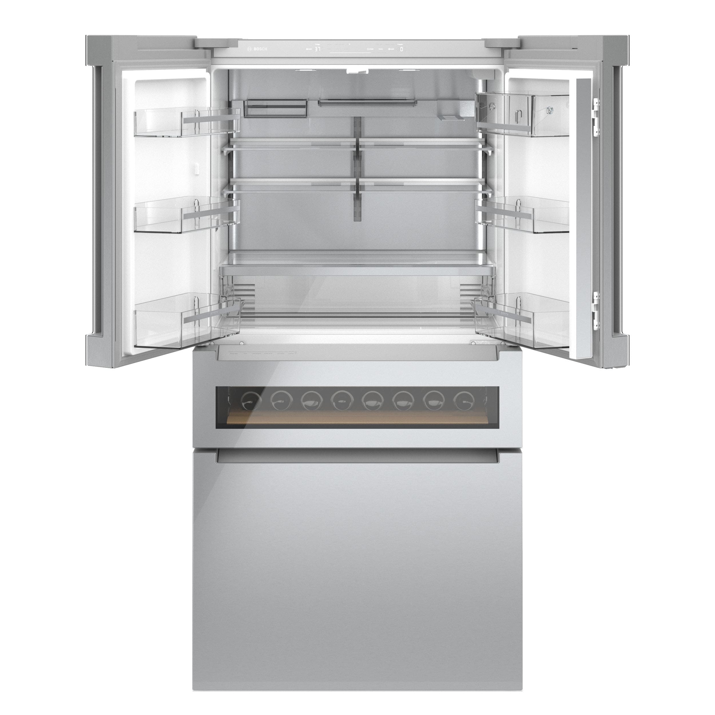 The new Bosch Refreshment Center refrigerator features an easy-to-clean glass over stainless steel exterior with a glass display drawer that holds up to 17 standard wine bottles or 35 standard beverage cans. Pre-programmed settings take the guesswork out of finding the optimal temperature. From craft beer and wines, to champagne, juice, and other beverages. Plus, Home Connect lets you easily manage your Bosch refrigerator from the convenience of your smartphone or tablet.