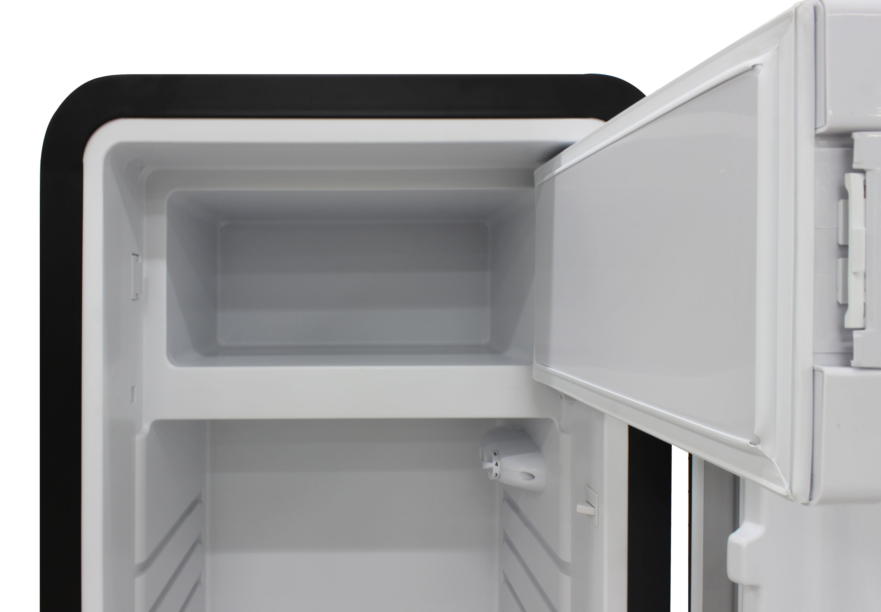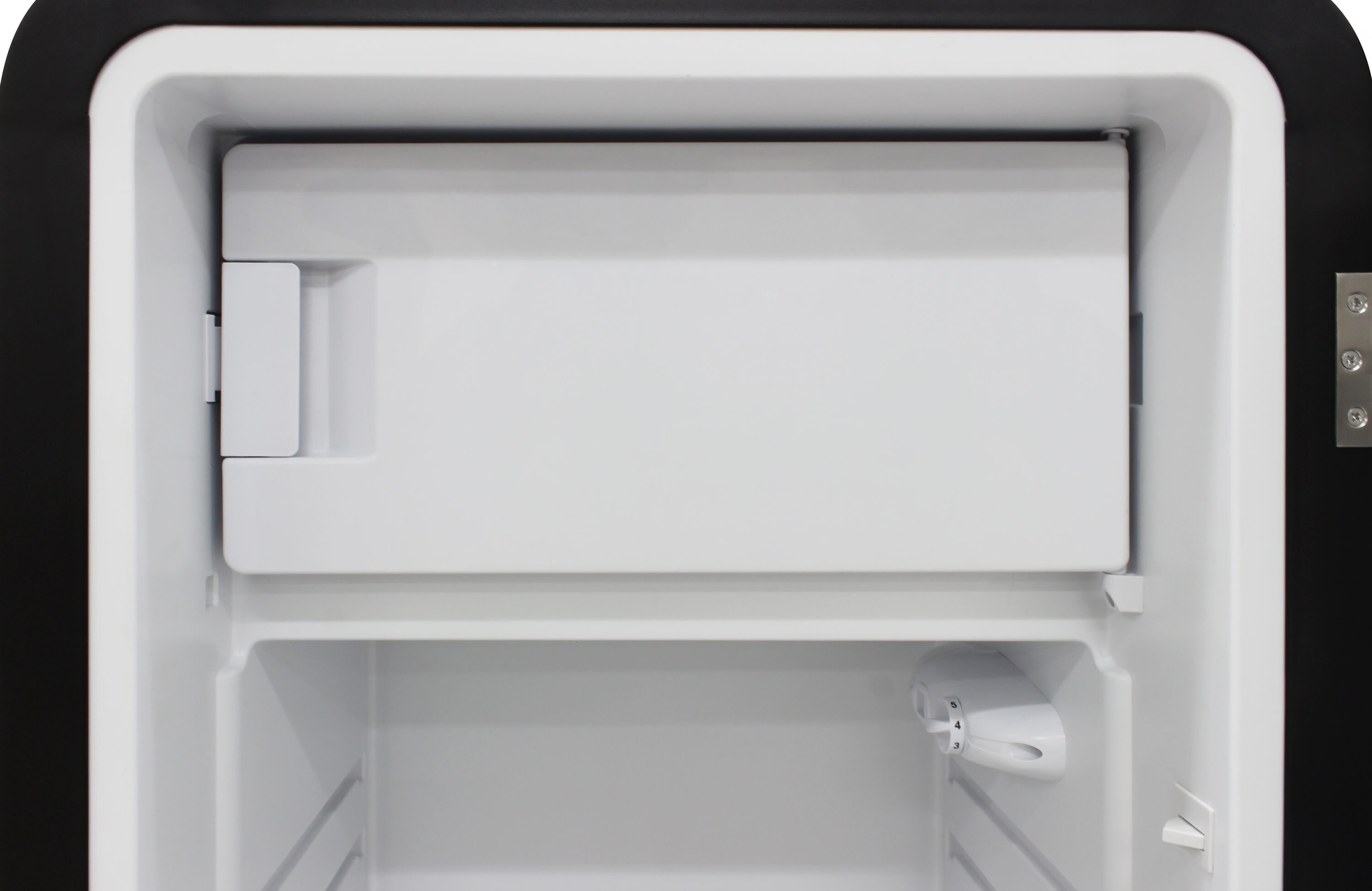 Keep all of your goods at the perfect serving temperature with the Brama Retro Refrigerator. This unit features a top freezer, interior light, open storage with 4 pull-out shelves including one metal wire racking, bottom bulk storage, and 4 rows of small storage behind the door. The black, rounded exterior with solid steel door gives a retro and modern look and makes a perfect addition to to any space.