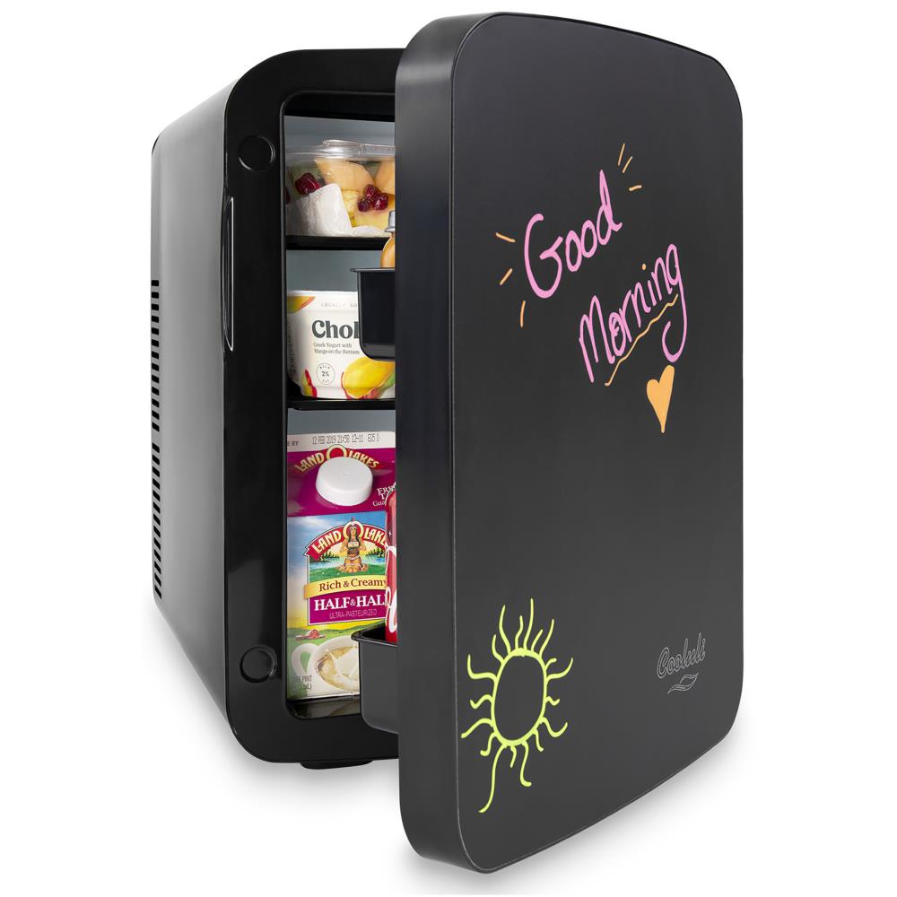 The Vibe-15LE Mini Fridge features a versatile, magnetic blackboard front which adds a new degree of cool to the standard mini fridge. The blackboard front adds a old-school vibe, while serving useful for writing lists/reminders. Use with regular chalk or liquid chalk markers (not included). Do not use with dry-erase pens/markers.NThe all-purpose Vibe is durable, efficient, and stylishly compact; change from cooling to warming with 1 quick switch. Perfect for storing food, drinks, breast milk, insulin, skincare and beauty products, medicine, and more.NThe compact design features a spacious 15-liter capacity, and molded foldaway top handle for easy portability. Fits up to 18 standard 12-oz. beverage cans! Use it everywhere—the Vibe’s sturdy construction and sleek look match any décor, making it the perfect addition to your home, office, dorm, hotel, car, and road trip!NExclusive EcoMax Technology features Cooluli’s unique cooling system that prevents frost, is quiet, energy efficient, and cost-effective. When maximum efficiency is reached, the Vibe goes into ECOmode—saving you money! The environmentally-friendly Vibe uses no refrigerants or Freons. It’s dual voltage and works worldwide. This unit features a 1 Year Limited Warranty and Cooluli’s unparalleled customer service.