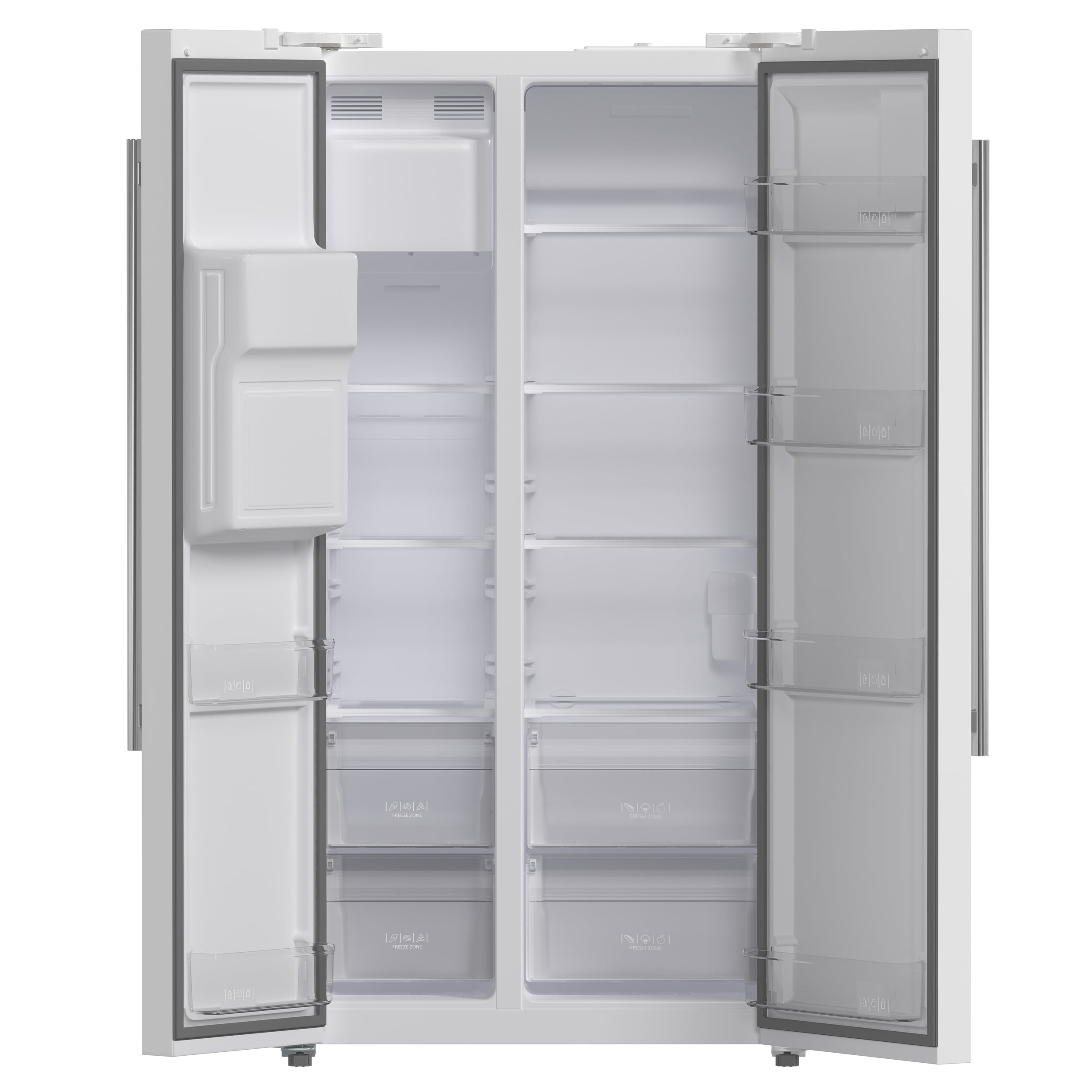 The Forno Salerno 36 Inch side-by-side white refrigerator delivers optimal performance and maximizes storage efficiency. The compressor inverter guarantees energy efficiency, quiet operation, and precise temperature control for optimal freshness. With a frost-free multi air flow cooling system, this appliance boasts a 20 cu.ft. capacity and adjustable shelving for versatile grocery storage. Experience convenience with the water and ice dispenser, featuring a touch screen control for intuitive access to ice options and temperature controls. The Fresh Food storage capacity of 13.48 cu.ft. includes 4 spill-proof shelves, 3 door bins, 1 gallon bin, and 2 crisper drawers. The 6.53 cu.ft. Freezer storage offers 3 spill-proof shelves, 2 door bins, and 2 storage drawers, ensuring optimal organization. This refrigerator is ENERGY STAR Certified for efficiency, and high-efficiency LED lighting minimizes food spoilage. Antique brass handles add an elegant finishing touch to this high-performing and stylish appliance.