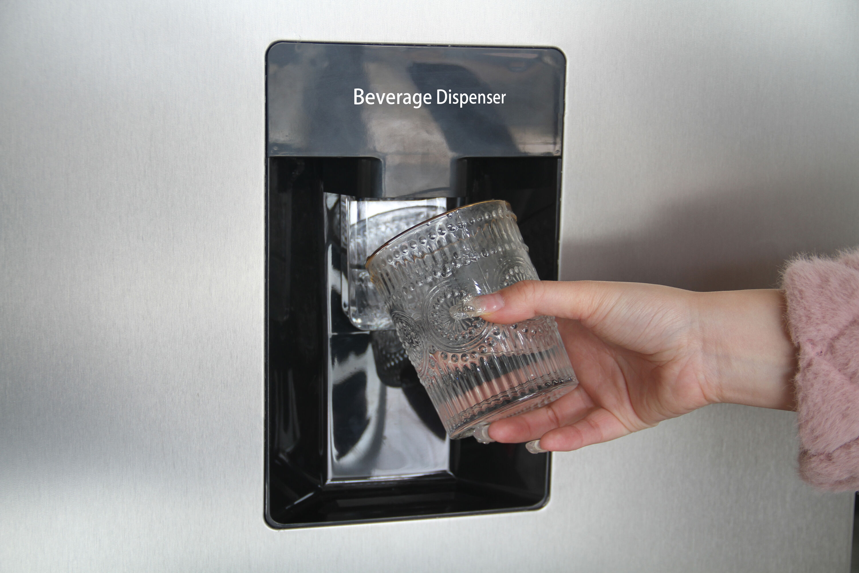 Door mounted exterior beverage dispenser allows for easy, on demand drinks without opening the door.