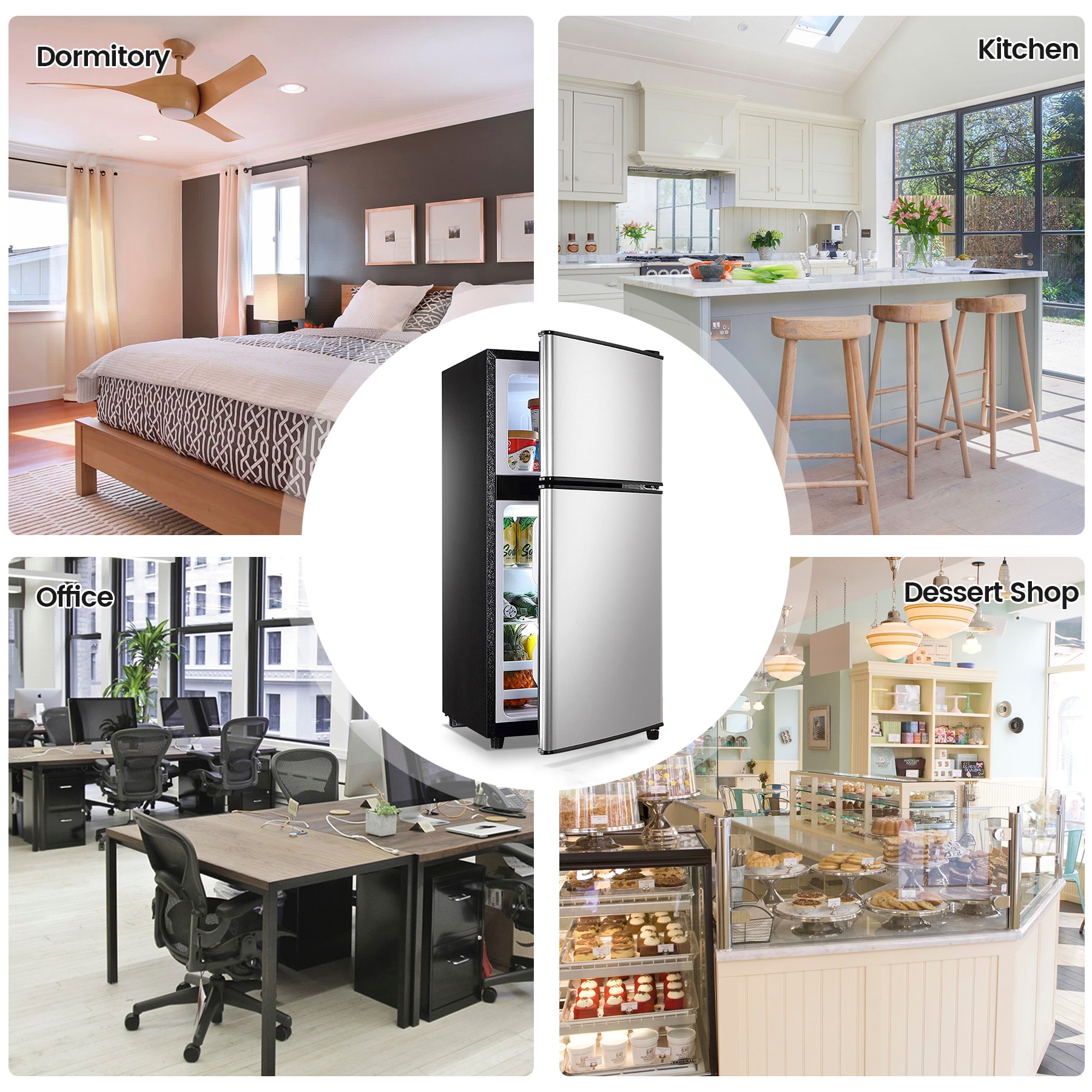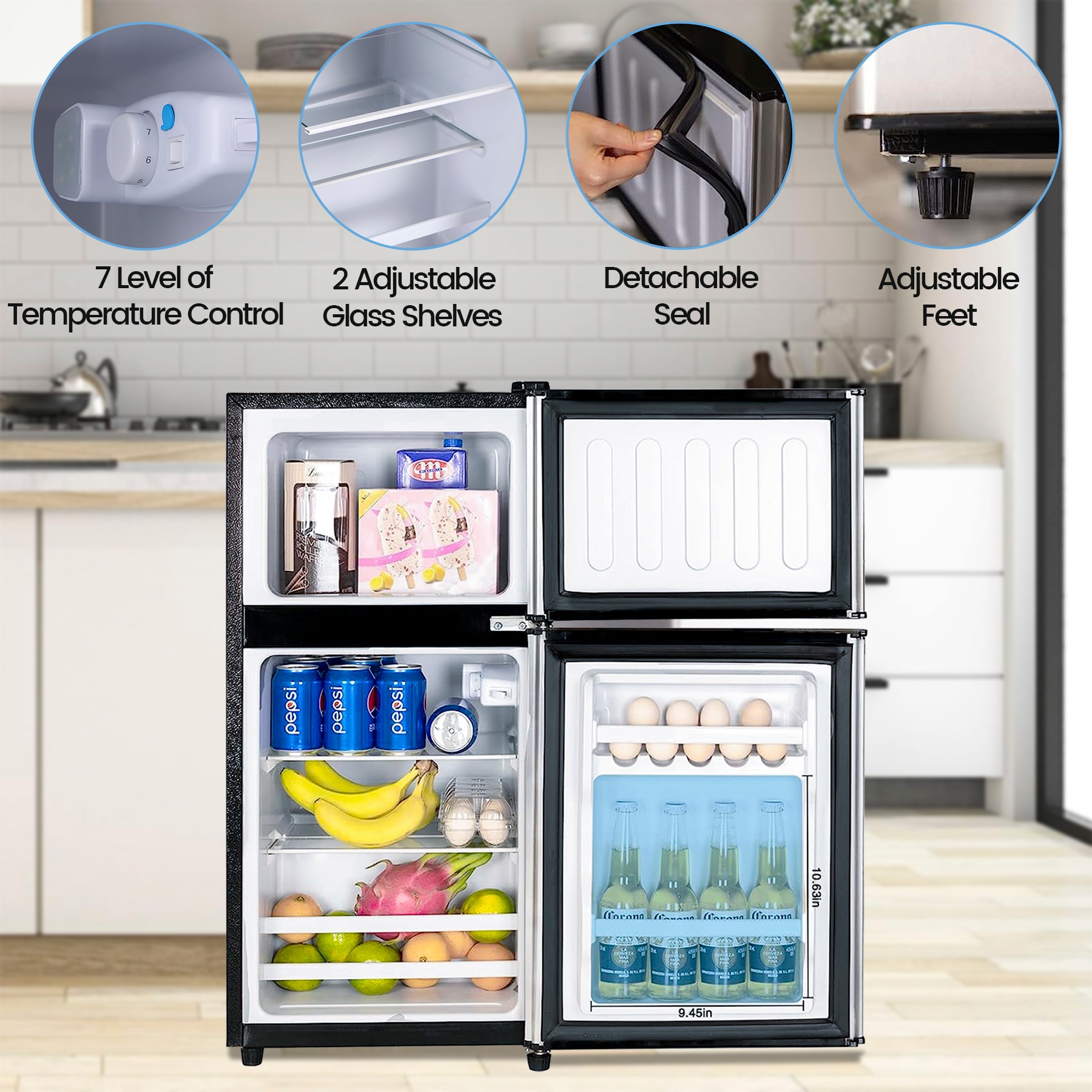 Top freezer design: large capacity of 3.5 cu ft is divided into refrigerator and freezer areas, the fridge has large 2.3 cu ft fresh food capacity for keeping foods organized and 1.2 cu ft freezer capacity for storing frozen foods, which are more spacious than ordinary mini refrigerators and can keep food fresh or frozen.