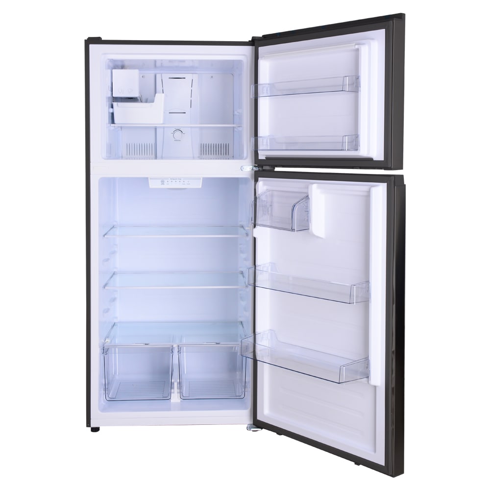 This Kenmore large black refrigerator and freezer has plenty of space to store your food and drinks, in style. This fridge has 18.1 cu. ft. of storage space, all in a 30-in wide footprint, saving space in your kitchen. Don’t worry, though, as this fridge with freezer is still the traditional standard-depth design! This refrigerator for your apartment or home comes with a factory installed icemaker that produces up to 4 lbs. of crescent shaped ice per day. With a sleek, stylish construction and three different finish options, this black appliance is sure to fit in to any decor scheme. It features adjustable, full-width glass shelves, so you can customize your fridge to fit taller bottles and make the most of your space. The clear humidity controlled crisper lets you choose the ideal humidity level to keep your fruits and vegetables fresh, while the clear dairy compartment can store all your butters and spreads at their ideal temperature. Both the refrigerator and the top freezer have clear door bins, 3 in the fridge that can store a gallon of milk and 2 in the freezer to help you keep things organized and easily accessible. And don’t worry about the energy bill, because this LED lighting refrigerator is ENERGY STAR® Certified, keeping energy use reasonable and costs low. The whole refrigerator freezer unit finishes with an elegant pocket style handle, recessed for a sleek flush-front design. Truly, it’s the perfect multifunctional fridge and freezer set for any home!