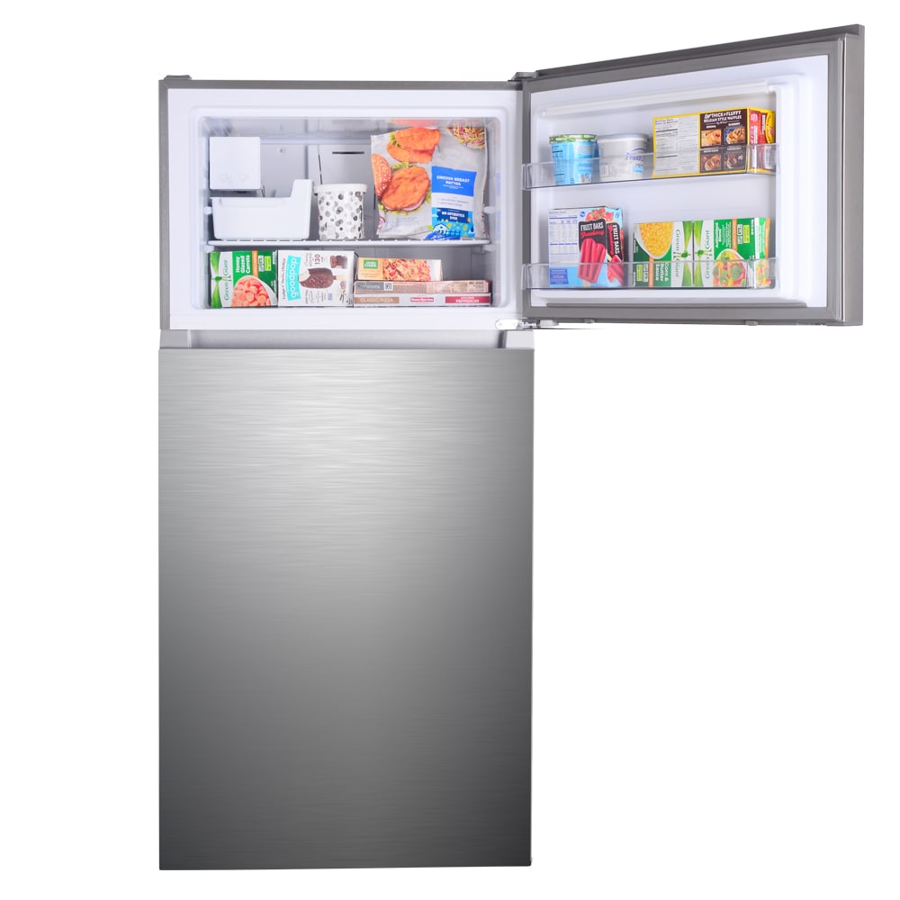 This Kenmore large fingerprint resistant Stainless Steel steel refrigerator and freezer has plenty of space to store your food and drinks, in style. This fridge has 18.1 cu. ft. of storage space, all in a 30-in wide footprint, saving space in your kitchen. Don’t worry, though, as this fridge with freezer is still the traditional standard-depth design! This refrigerator for your apartment or home comes with a factory installed icemaker that produces up to 4 lbs. of crescent shaped ice per day. With a sleek, stylish construction and three different finish options, this fingerprint resistant Stainless Steel steel appliance is sure to fit in to any decor scheme. It features adjustable, full-width glass shelves, so you can customize your fridge to fit taller bottles and make the most of your space. The clear humidity controlled crisper lets you choose the ideal humidity level to keep your fruits and vegetables fresh, while the clear dairy compartment can store all your butters and spreads at their ideal temperature. Both the refrigerator and the top freezer have clear door bins, 3 in the fridge that can store a gallon of milk and 2 in the freezer to help you keep things organized and easily accessible. And don’t worry about the energy bill, because this LED lighting refrigerator is ENERGY STAR® Certified, keeping energy use reasonable and costs low. The whole refrigerator freezer unit finishes with an elegant pocket style handle, recessed for a sleek flush-front design. Truly, it’s the perfect multifunctional fridge and freezer set for any home!