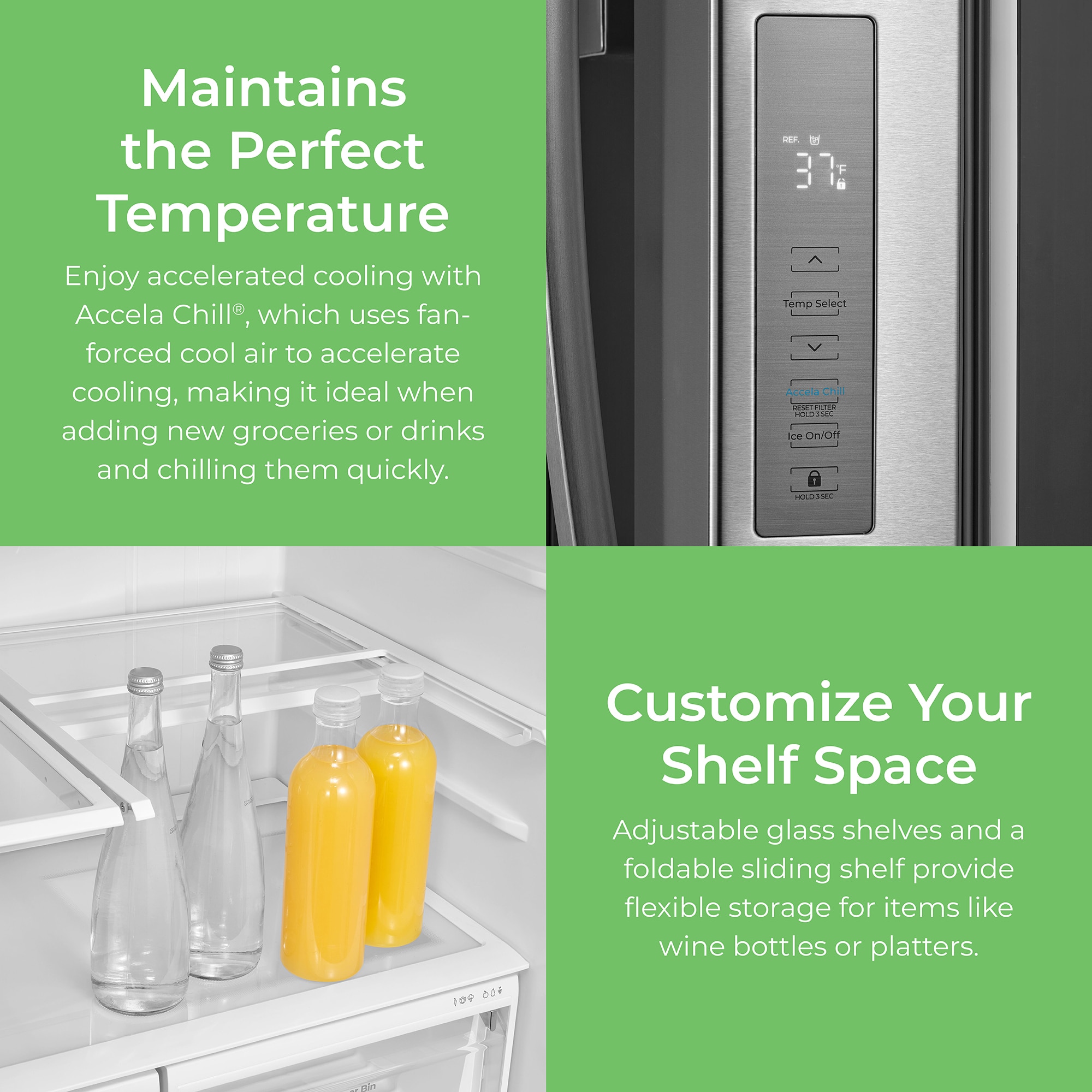 THE Kenmore 28.6 cu. ft. French Door Refrigerator offers spacious storage and advanced features. The Inverter Compressor maintains consistent temperatures and quiet operation. The Accela Chill feature rapidly cools groceries, while the Multi-Flow Air System ensures even cooling throughout. The Dual Evaporator provides independent cooling for the refrigerator and freezer to optimize temperature and humidity. Adjustable glass shelves, a foldable sliding shelf, and spill-proof shelves provide flexible storage and easy cleanup. The full-width pantry drawer accommodates large platters, while humidity-controlled crispers preserve freshness. The two-tier freezer drawer organizes frozen items, and gallon-size door bins free up shelf space. The NSF®-certified water filter, plus a water and ice dispenser, offer clean, high-quality water and ice. ENERGY STAR® certified for efficiency while fingerprint-resistant stainless steel makes cleaning easy, and LED lighting brightens every corner.