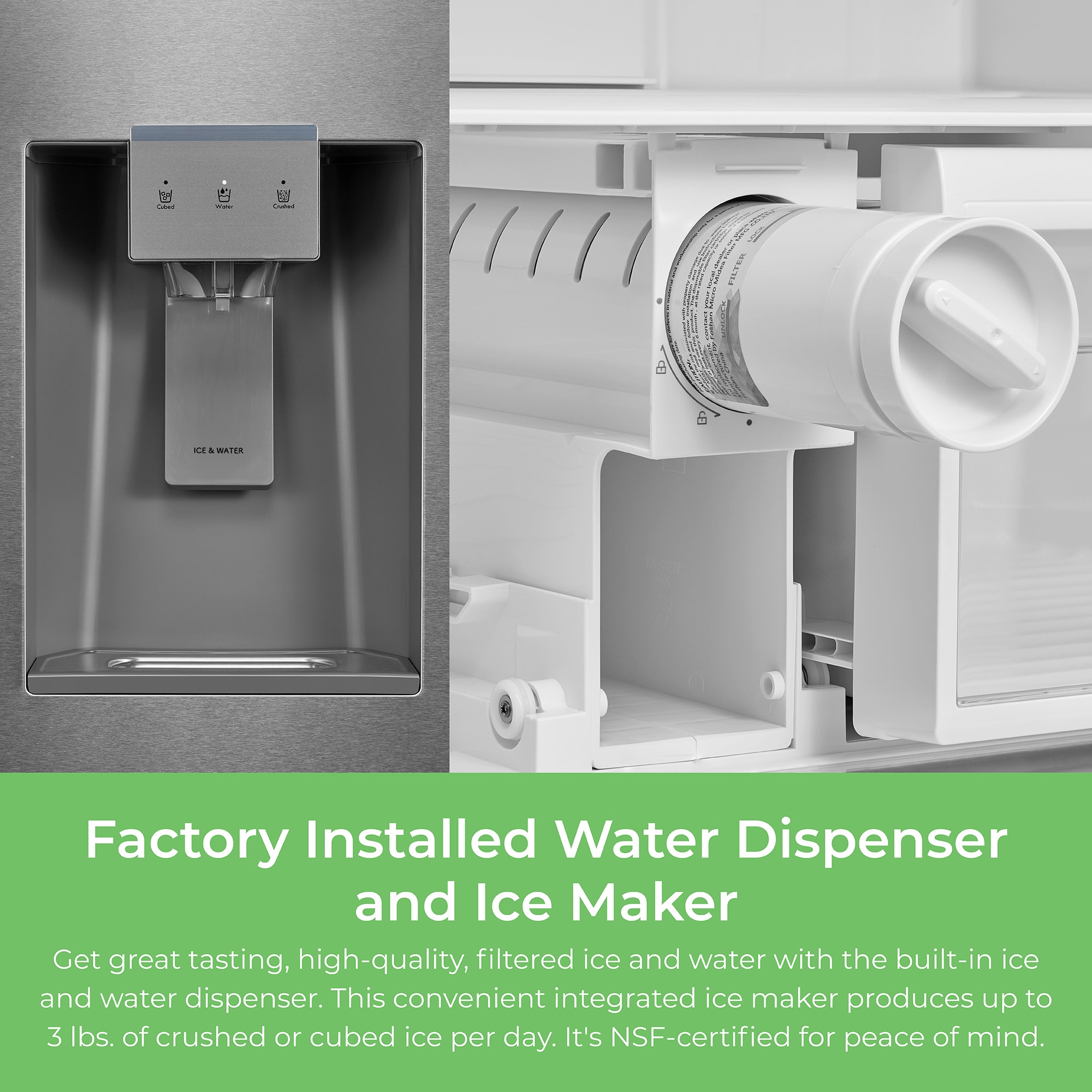 NSF-certified water filter and ice dispenser with cubed/crushed ice, produces up to 3 lbs daily