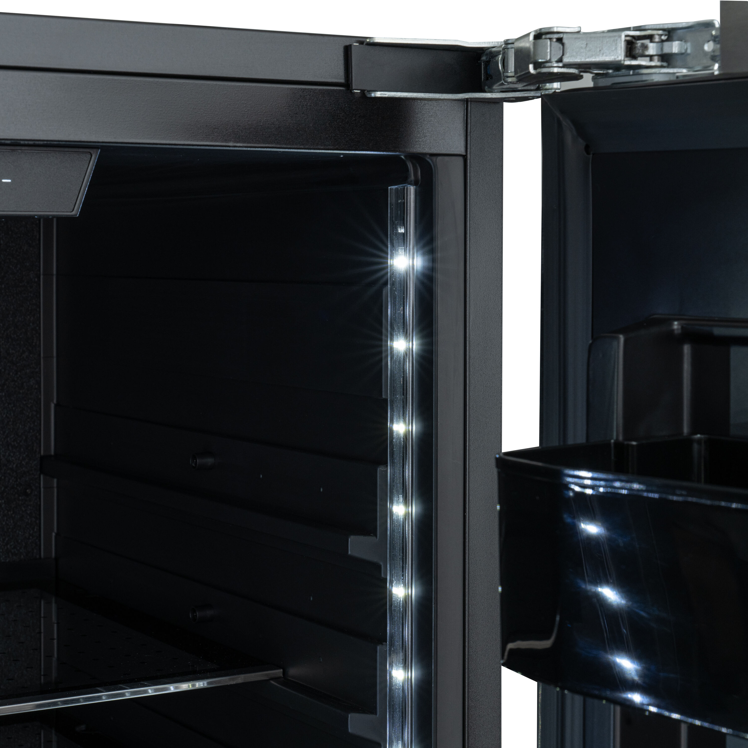 Adjustable Glass Shelves: Customize your storage space with adjustable glass shelves, They provide flexibility to accommodate items of various sizes and shapes, from tall bottles to bulky containers, optimizing storage efficiency.
