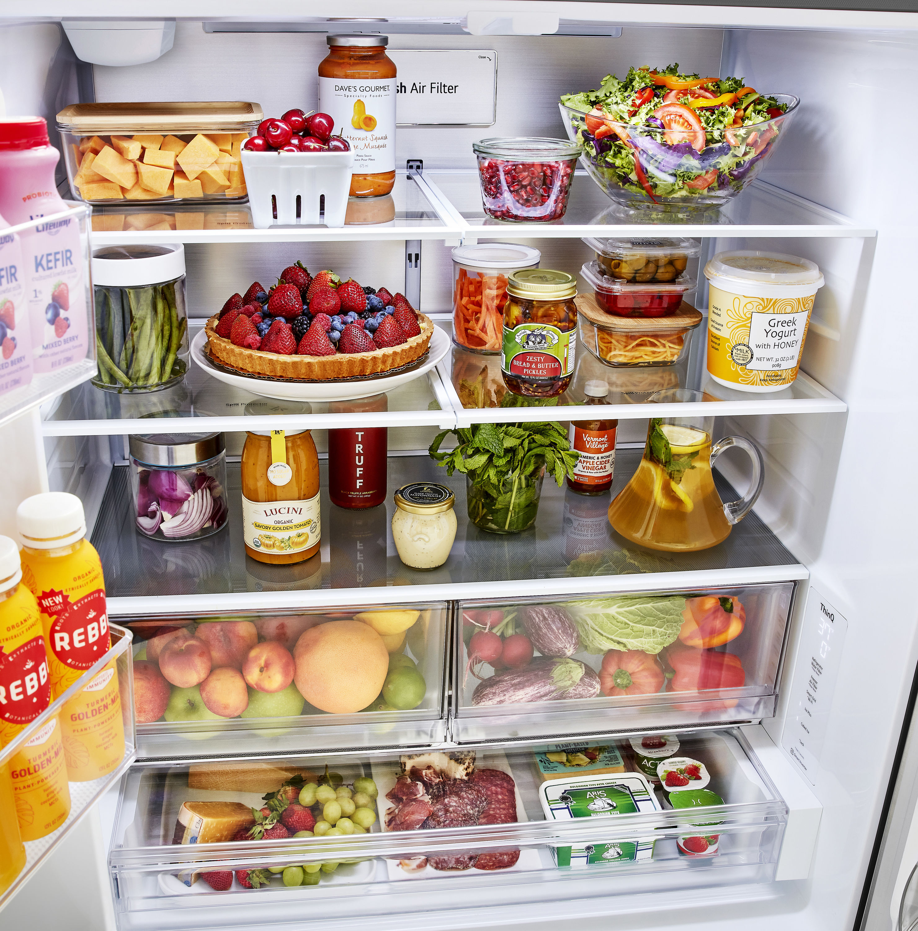 Crisper drawers and a full-length Glide N’ Serve drawer are a great place to keep fruits, vegetables, and more