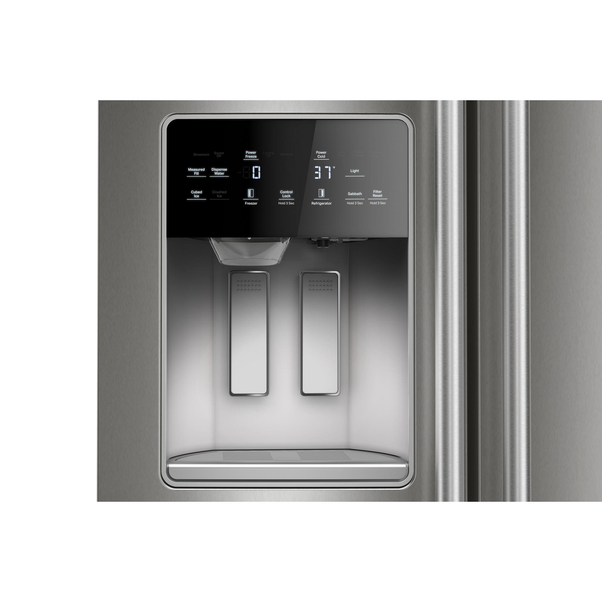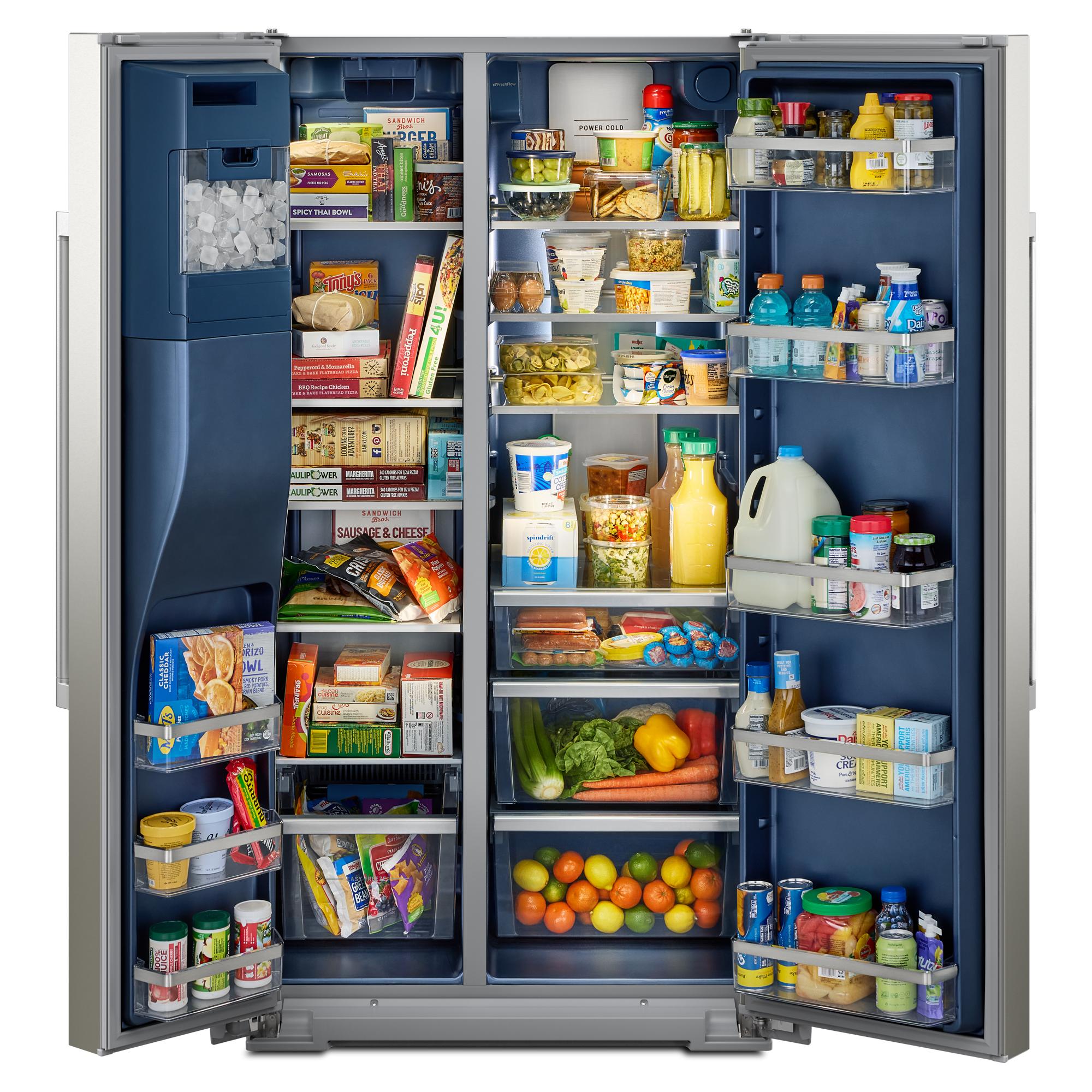 This 36 inch side-by-side refrigerator has ultimate cooling performance. The PowerCold® feature takes your groceries from room temp to chilly quickly, and the EvenAir Cooling System keeps everything consistently cold front to back. The LED light tower lets you see corner to corner on every shelf, all against a striking Arctic Blue Interior. Plus, optimize your kitchen space with styling that fits virtually flush with the countertop.