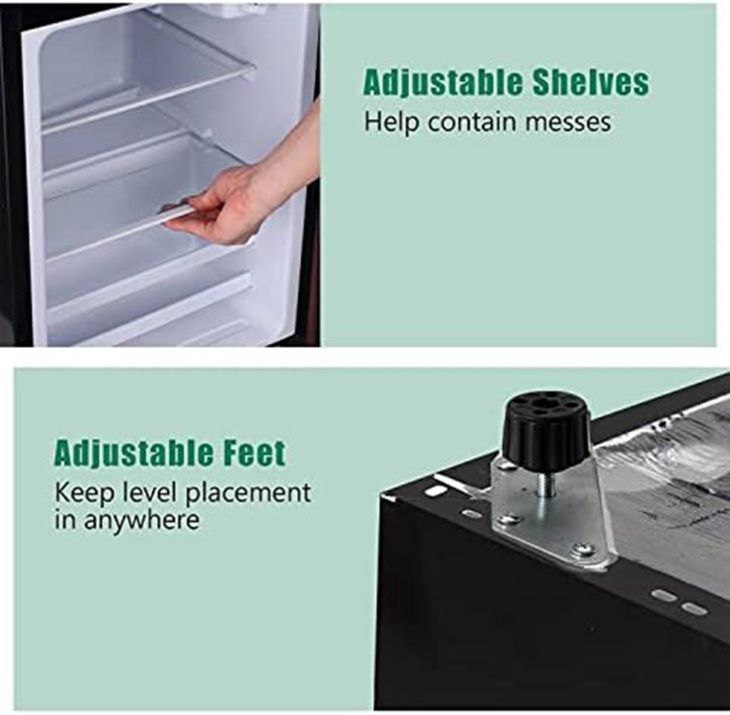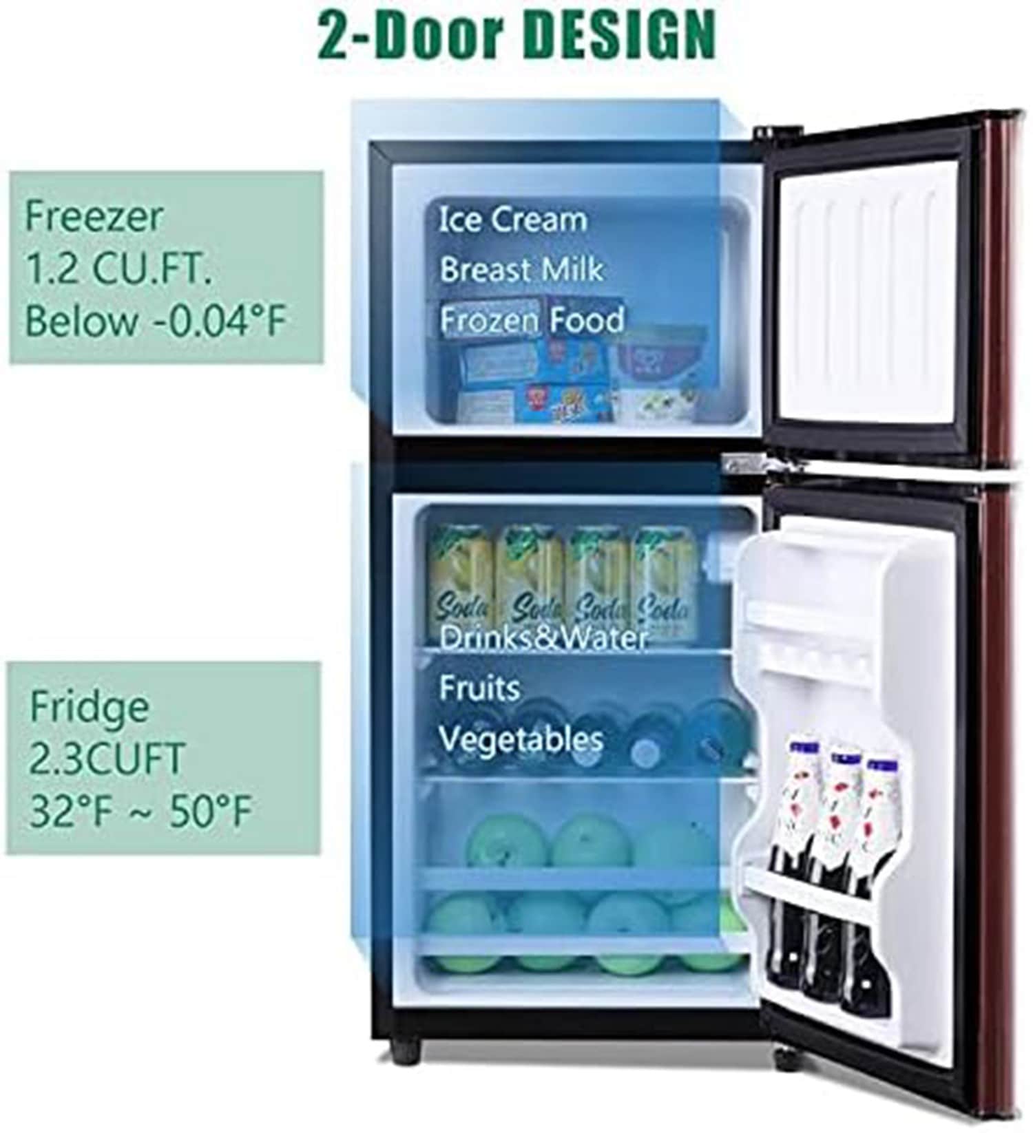 Two Door Design-the fridge has large 2.3 cu ft fresh food capacity for keeping foods organized and 1.2 cu ft freezer capacity for storing frozen foods