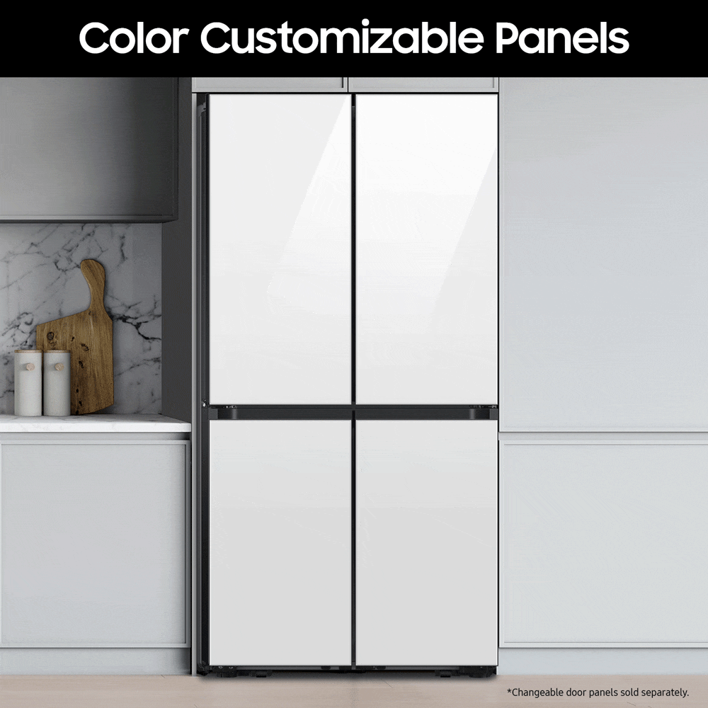 Samsung’s Bespoke 4-Door Flex™ Counter Depth 23 cu-ft Refrigerator features AI Family Hub™+ with the industry’s largest screen (Refrigerator smart video screen) and changeable door panels; (Changeable door panels are sold separately) AI Vision Inside(As of March 2024, AI Vision Inside can recognize 33 food items like fresh fruits and veggies; Recognizable food items will be regularly added and updated; If the food is covered by hand and not recognizable, it may be listed as an unknown item, but the user can always revise the item title through the Family Hub™ or SmartThings) automatically recognizes what’s in your fridge, so you always know what’s inside; Beverage Center™ provides quick and easy access to refreshingly cold water two ways; Open the refrigerator with ease, even if your hands are full with Auto Open Door; With just a light touch of the door sensor, the refrigerator door will open (An automatic closing function is not available; the actual open angle of the doors can be different by the installation circumstances and usage conditions like storing heavy items in the door bins; touch sensors can be turned on/off from the control panel/display, and its default setting is off).
