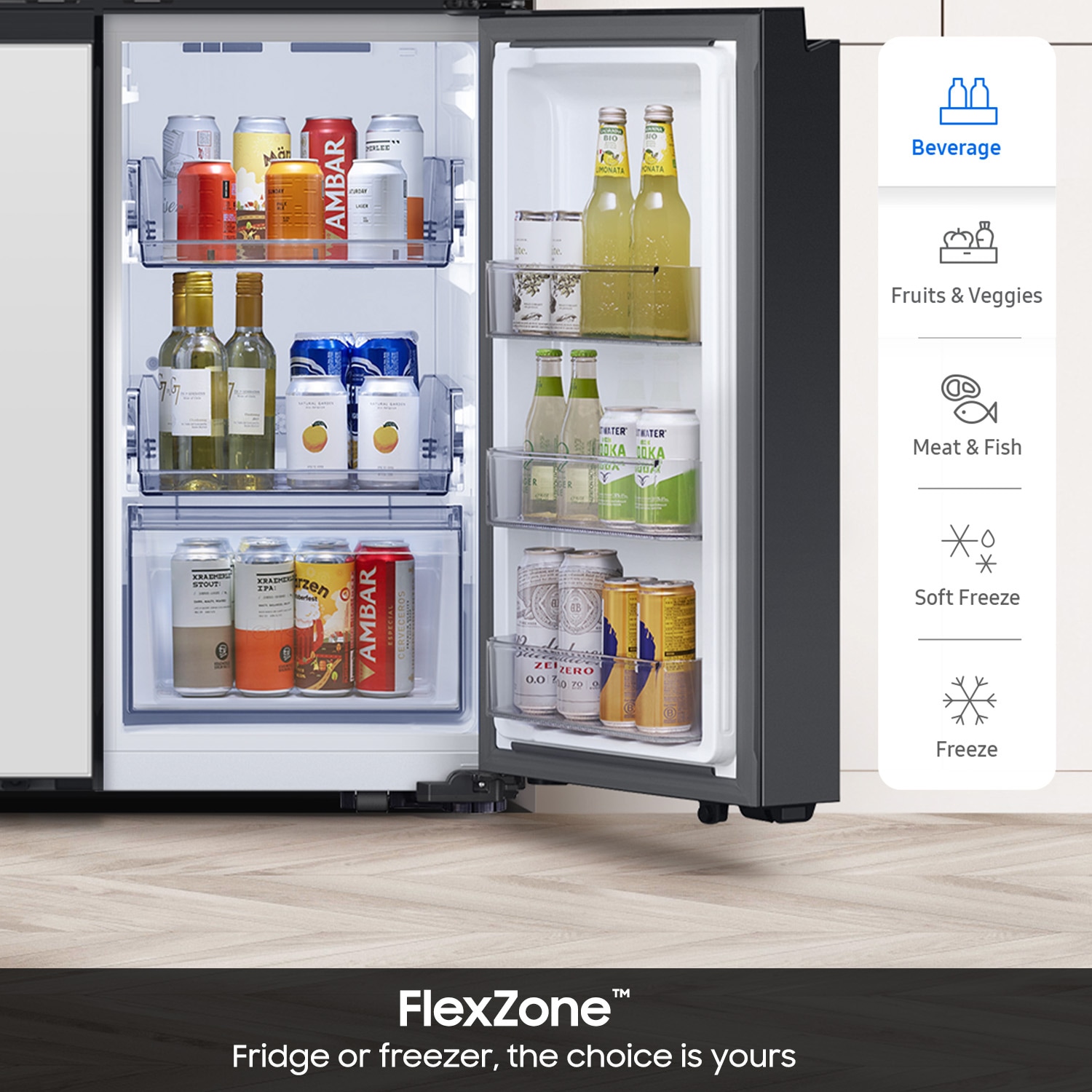 FlexZone™: Customize your lower-right storage space to be a refrigerator or freezer; With five adjustable temperature settings, you can store almost any food item from fruits and vegetables to your favorite ice cream