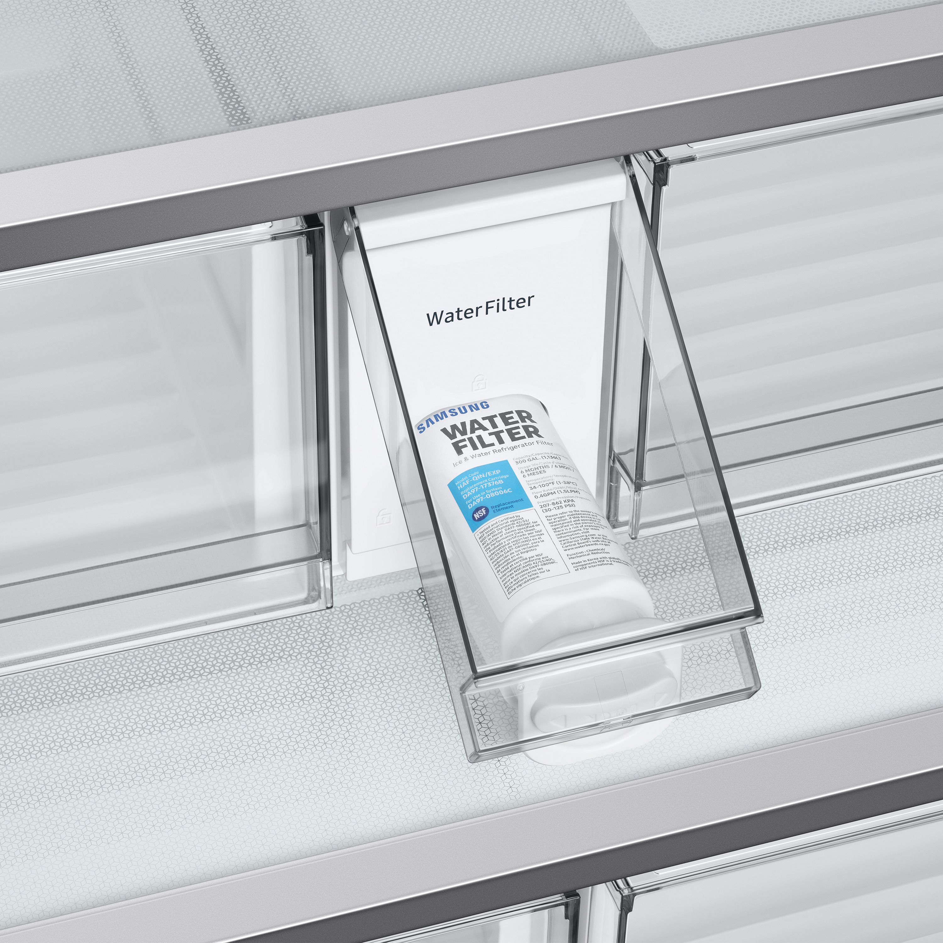 Extra-large capacity 3-Door French Door Refrigerator with customizable and changeable door panels available in a variety of colors and finishes featuring Family Hub. Samsung’s Family Hub lets you see inside your refrigerator, manage your family’s calendars, stream music, see who’s at the front door and much more, all right from your fridge. It also features the Beverage Center with both a water dispenser and AutoFill Water Pitcher. Plus a Dual Ice Maker with cubed ice and Ice Bites