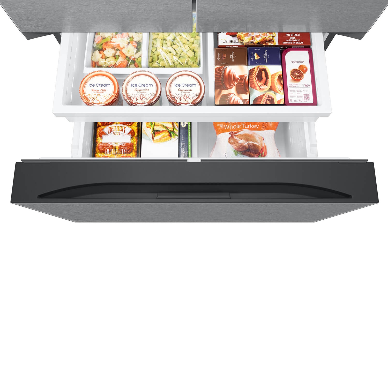 Samsung’s 26 cu. ft. Mega Capacity Counter Depth, 3-Door French Door refrigerator has a modern design to blend seamlessly into your kitchen. Get extra space to store more groceries, including big and bulky items. Plus, get easy access to chilled, filtered water and curved or crushed ice with the external water and ice dispenser.