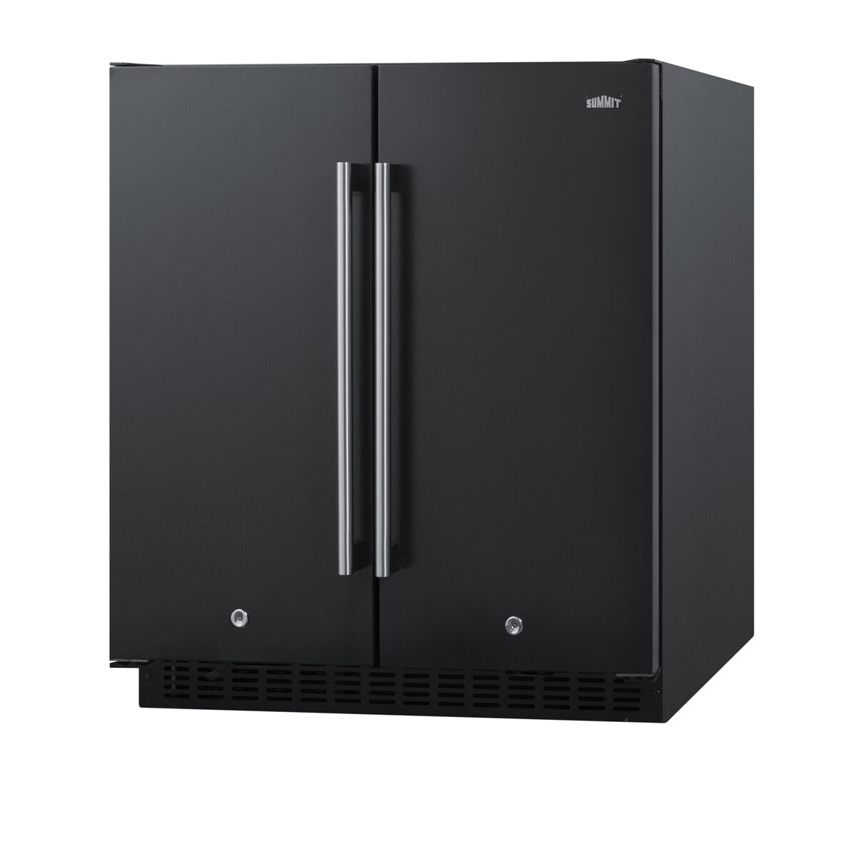 SUMMIT brings quality and value under the counter with a large collection of built-in refrigeration. Sized at 30″ wide, the FFRF3070B is an all-in-one side-by-side refrigerator-freezer. The front breathing design allows built-in installation under counters, while the fully finished cabinet also enables freestanding use. This unit features a jet black exterior with stainless steel handles. Each compartment has a factory installed front lock for added security. The sealed back ensures easier cleanup with added space savings. Inside, the FFRF3070B features a 2.4 cu.ft. frost-free freezer compartment on the left and a 3 cu.ft. frost-free refrigerator compartment on the right. The refrigerator includes a digital thermostat allowing users to manage the temperature in each compartment, with a readout in Celsius or Fahrenheit for added convenience. Adjustable glass shelves offer cleaner spill-proof storage for fresh food items, while two removable door shelves provide additional storage space as needed. An internal fan assures the compartment is cooled evenly from top to bottom. The freezer compartment includes adjustable wire shelves to ensure proper cold air circulation. Both sides feature LED lighting to provide an attractive, energy efficient presentation. The slotted floor design is ideal for keeping bottles safely in place. Additional features include an open door alarm, high temperature alarm, and Sabbath mode setting that allows you to disable certain functions during religious observance. With its innovative all-in-one design, user-friendly features, and full frost-free operation, the FFRF3070B is a great choice for smaller kitchens looking to maximize storage space under the counter.