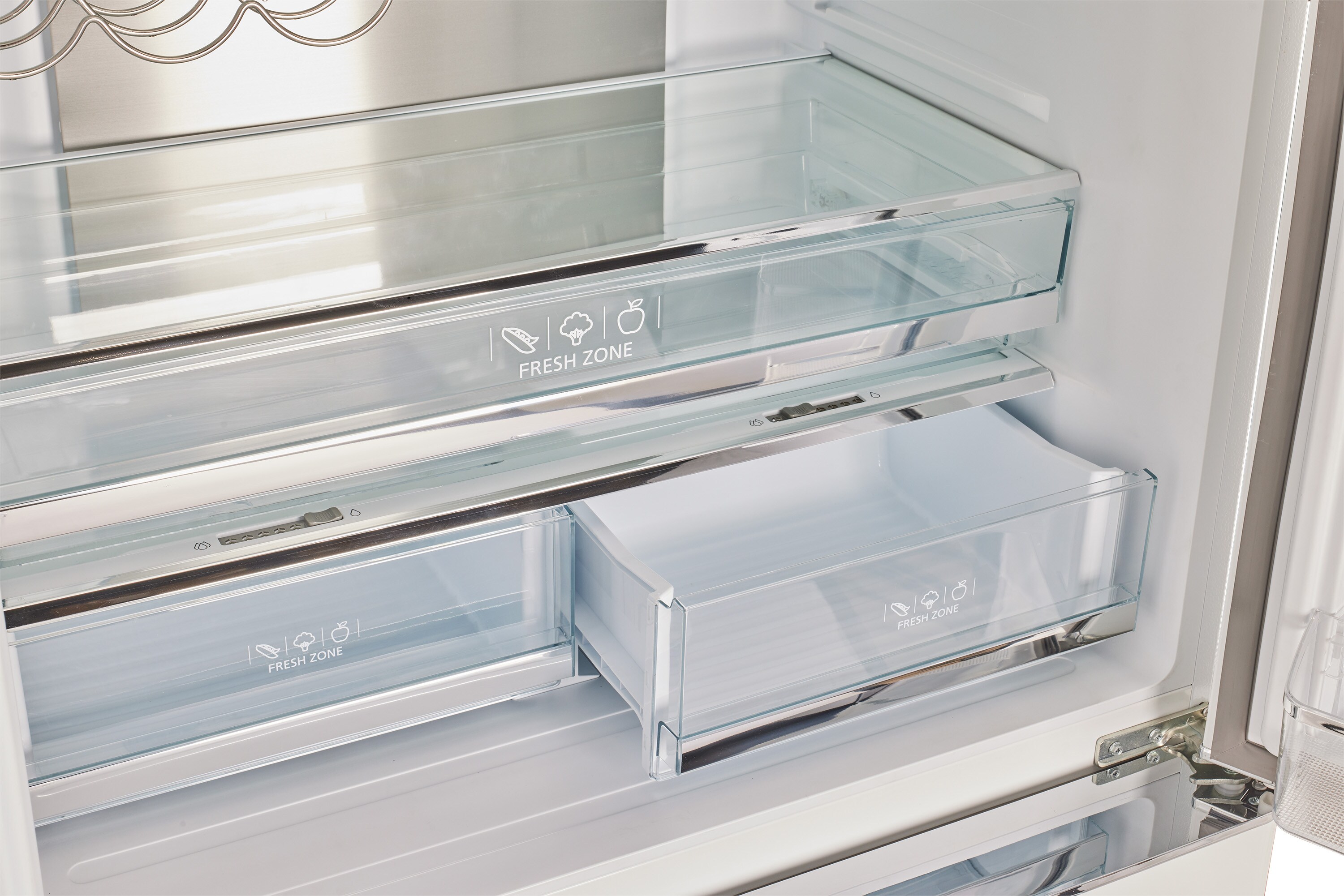 The 21.4 cu. ft. French door refrigerator, a stylish and energy-efficient addition to your kitchen. This refrigerator not only boasts a generous storage capacity but is also Energy Star certified. Say goodbye to tedious defrosting with its frost-free design, allowing you to enjoy a hassle-free experience while maintaining the freshness of your groceries. The family-sized design prioritizes convenience with adjustable shelves and ample door storage, accommodating the diverse needs of a busy household.