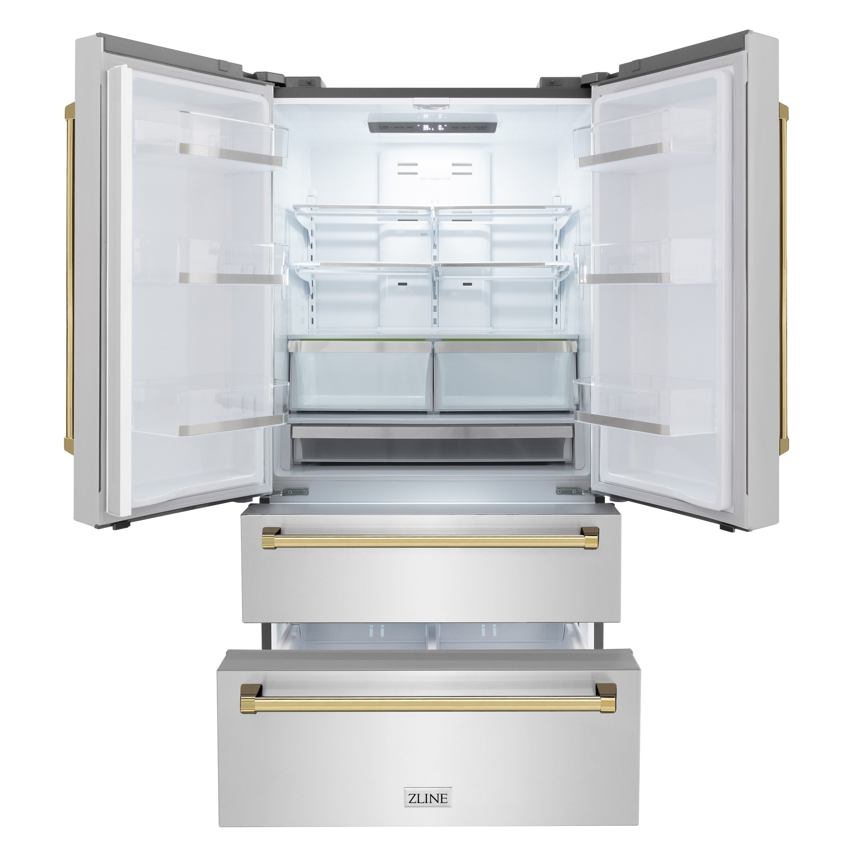 Luxury isn’t meant to be desired – it’s meant to be attainable. The ZLINE Autograph Edition 36 in. 22.5 cu. ft. Counter-Depth French Door Refrigerator with Ice Maker in Fingerprint-Resistant Stainless Steel with Polished Gold Traditional Handles (RFMZ-36-G) delivers an elevated experience by pairing innovative dual cooling technology with a spacious counter-depth design and a high-capacity built-in ice maker. Achieve ZLINE Attainable Luxury® excellence with timeless features designed to enhance your kitchen’s capability.