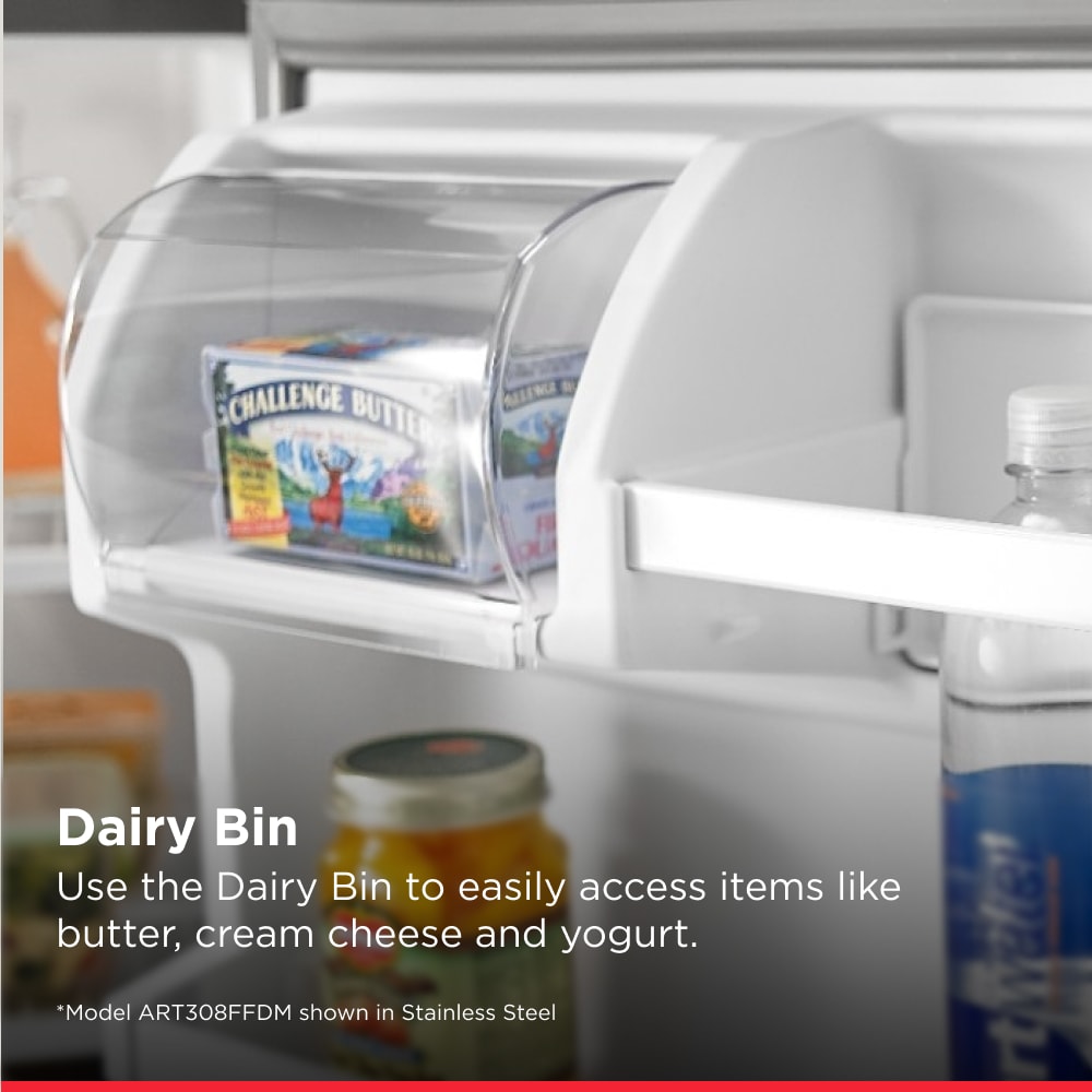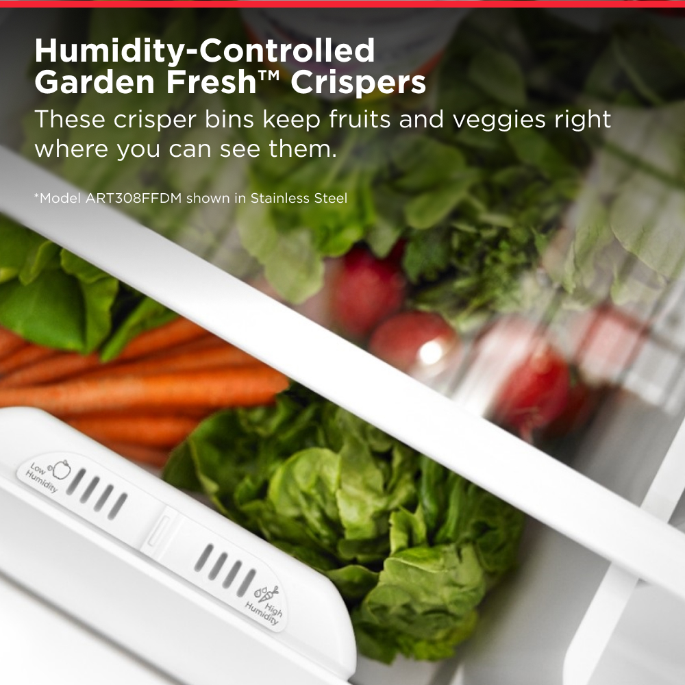 Experience the benefit of Garden Fresh™ Crisper Bins. This Amana® Top- Freezer Refrigerator comes with humidity-controlled, Garden Fresh™ Crisper Bins that help greens stay green, so you can spend less time doing grocery runs. Plus, you can fill your fridge just how you like it with the Gallon Door Storage Bins and the adjustable Flip-Up Storage Shelf.