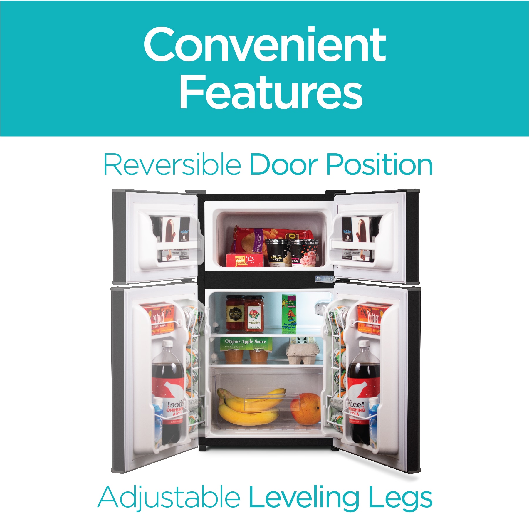 The mini fridge has a modern 2 door design that fits with style into any indoor living space. Adding convenience to any room for real-life practicality, it is perfectly compact without compromising interior storage space. You will be amazed by how much it fits. The free standing, flat back unit fits easily under counters and desks, or in room corners. The adjustable temperature control, 2 removable glass shelves, reversible door, and quiet operation make daily life a lot easier with one small appliance.
