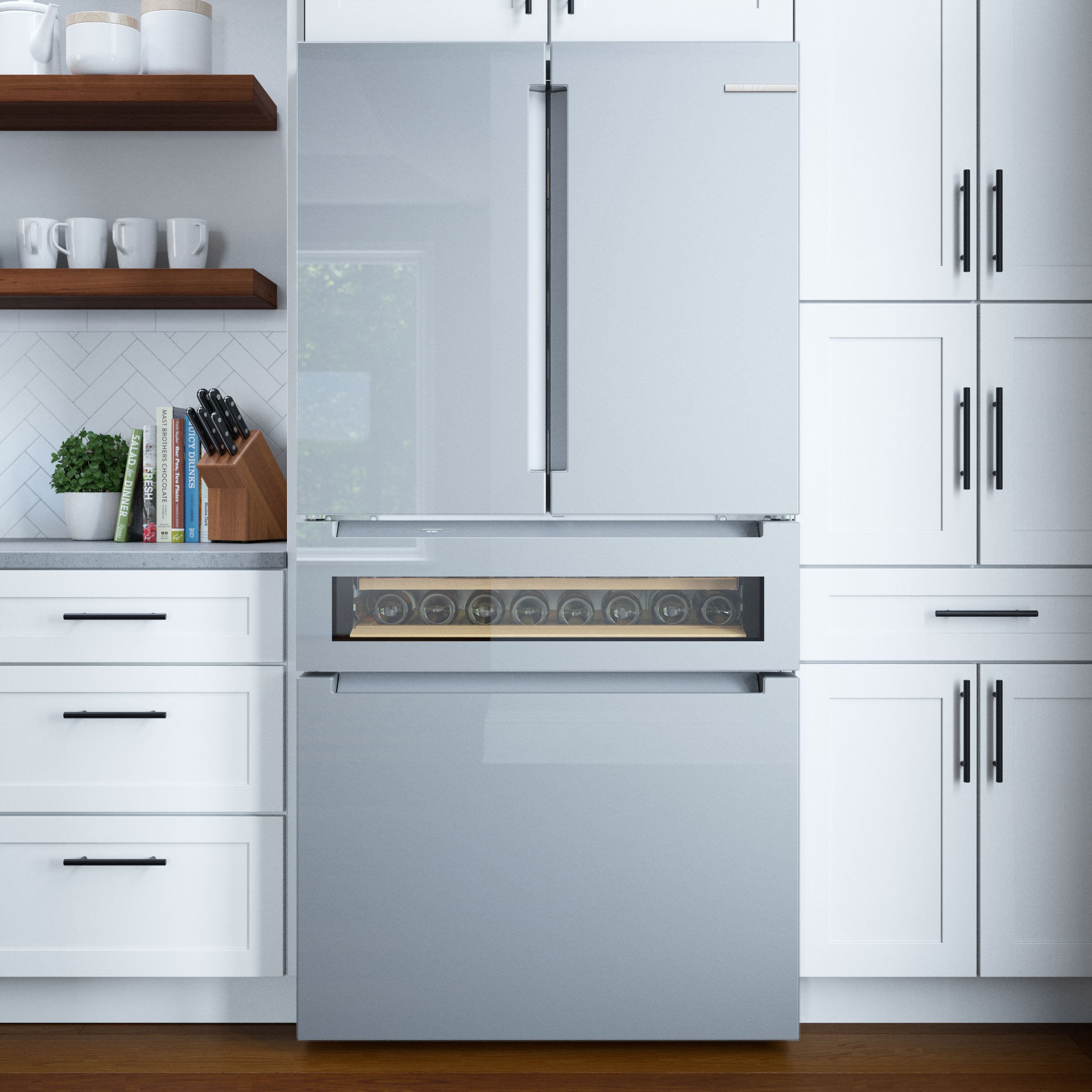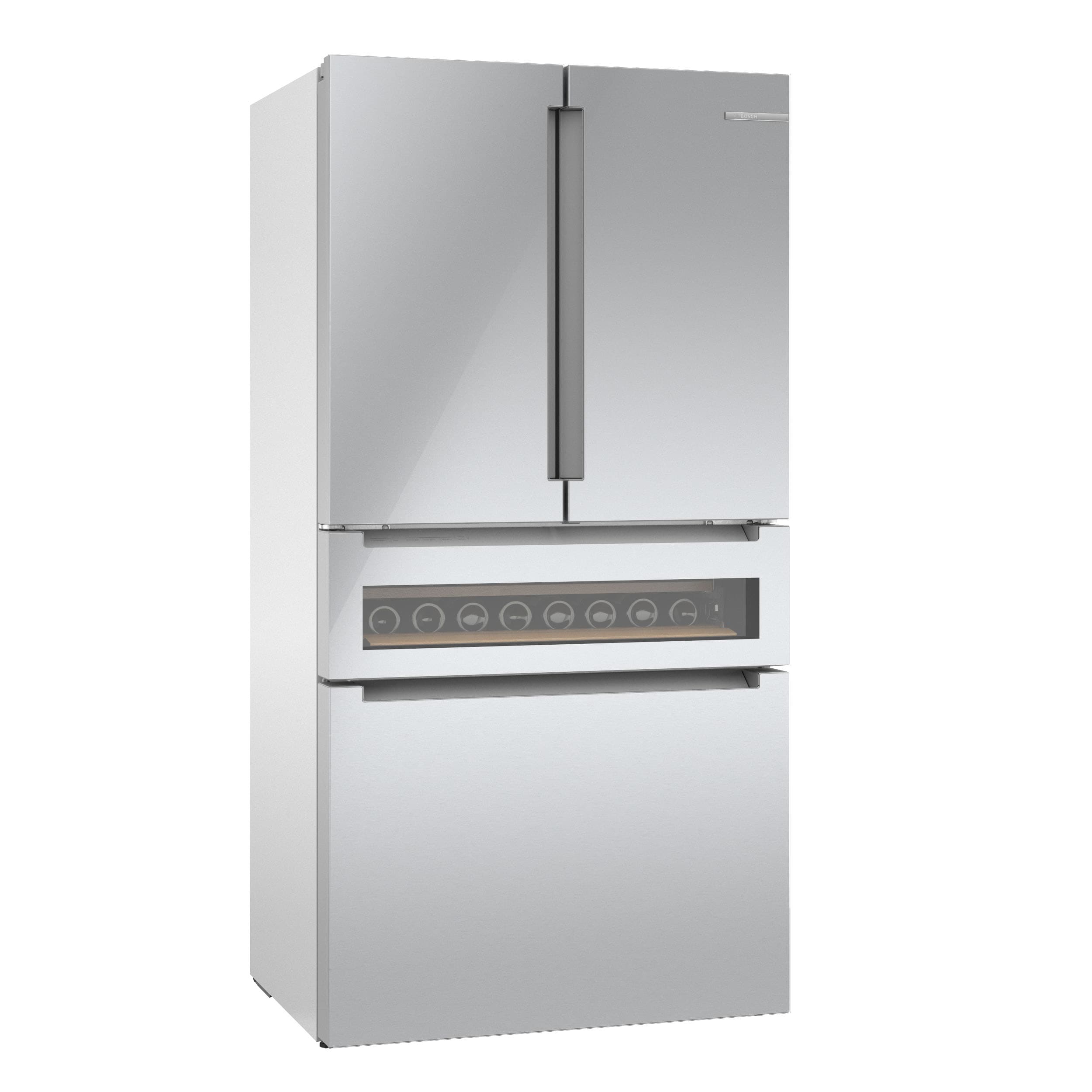 The new Bosch Refreshment Center refrigerator features an easy-to-clean glass over stainless steel exterior with a glass display drawer that holds up to 17 standard wine bottles or 35 standard beverage cans. Pre-programmed settings take the guesswork out of finding the optimal temperature. From craft beer and wines, to champagne, juice, and other beverages. Plus, Home Connect lets you easily manage your Bosch refrigerator from the convenience of your smartphone or tablet.