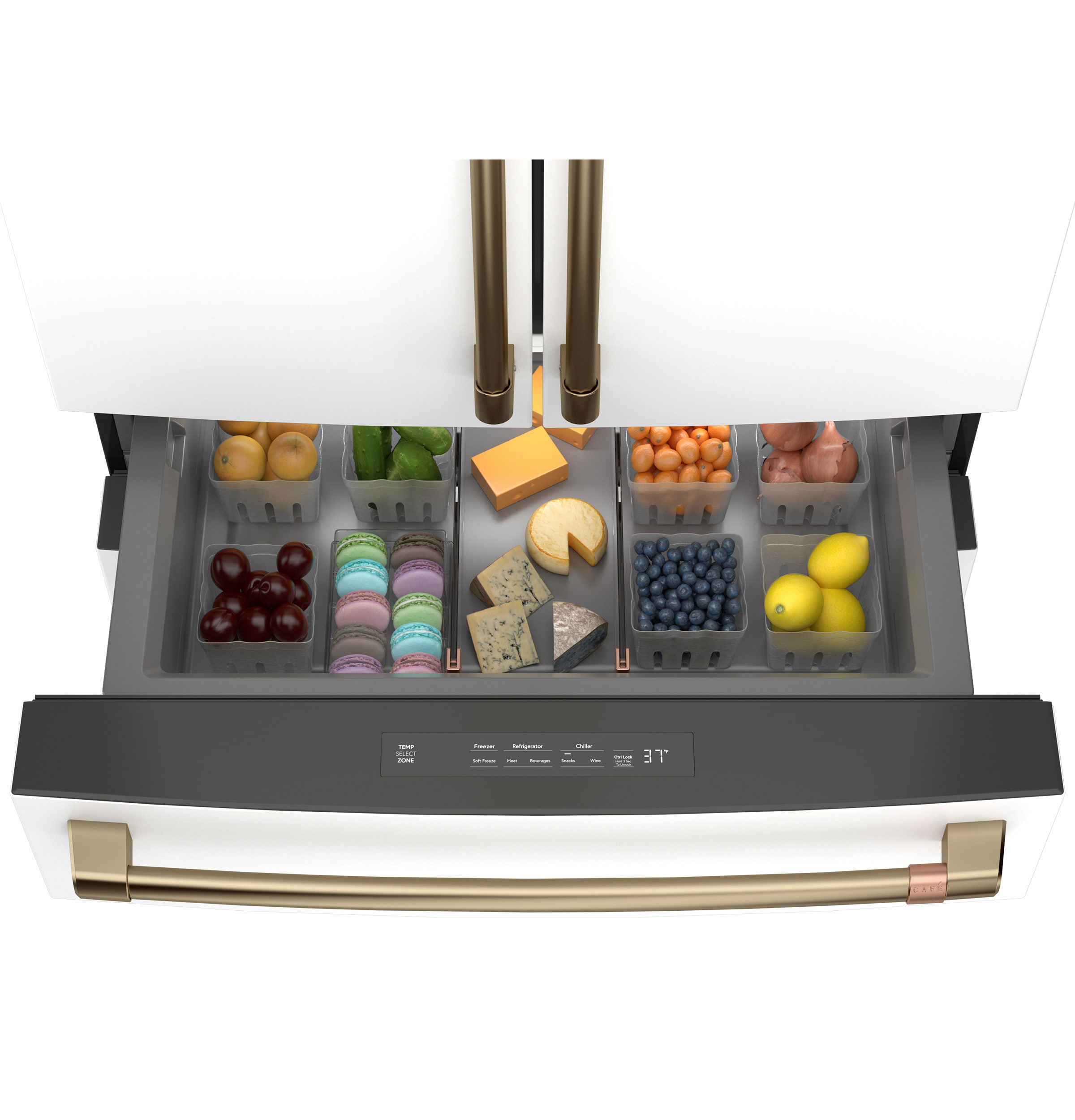Glass Dividers in Convertible Drawer – this stylish refrigerator convertible drawer features glass dividers for a clean, aesthetic storage solution that allows for simplified organization
