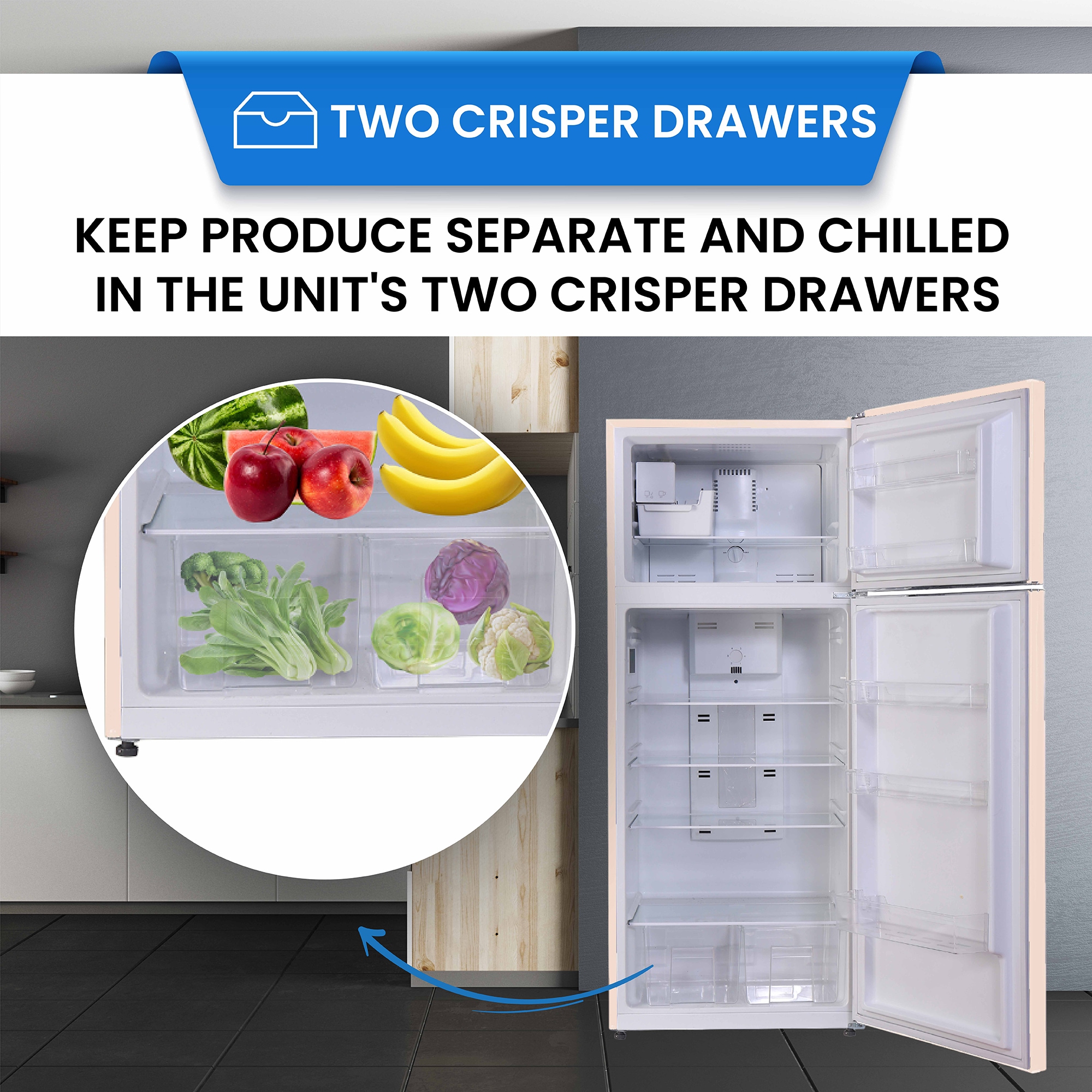 TWO CRISPER DRAWERS – Keep all produce items separate from other food items — and chilled at the right temperature — in the unit’s two crisper drawers.