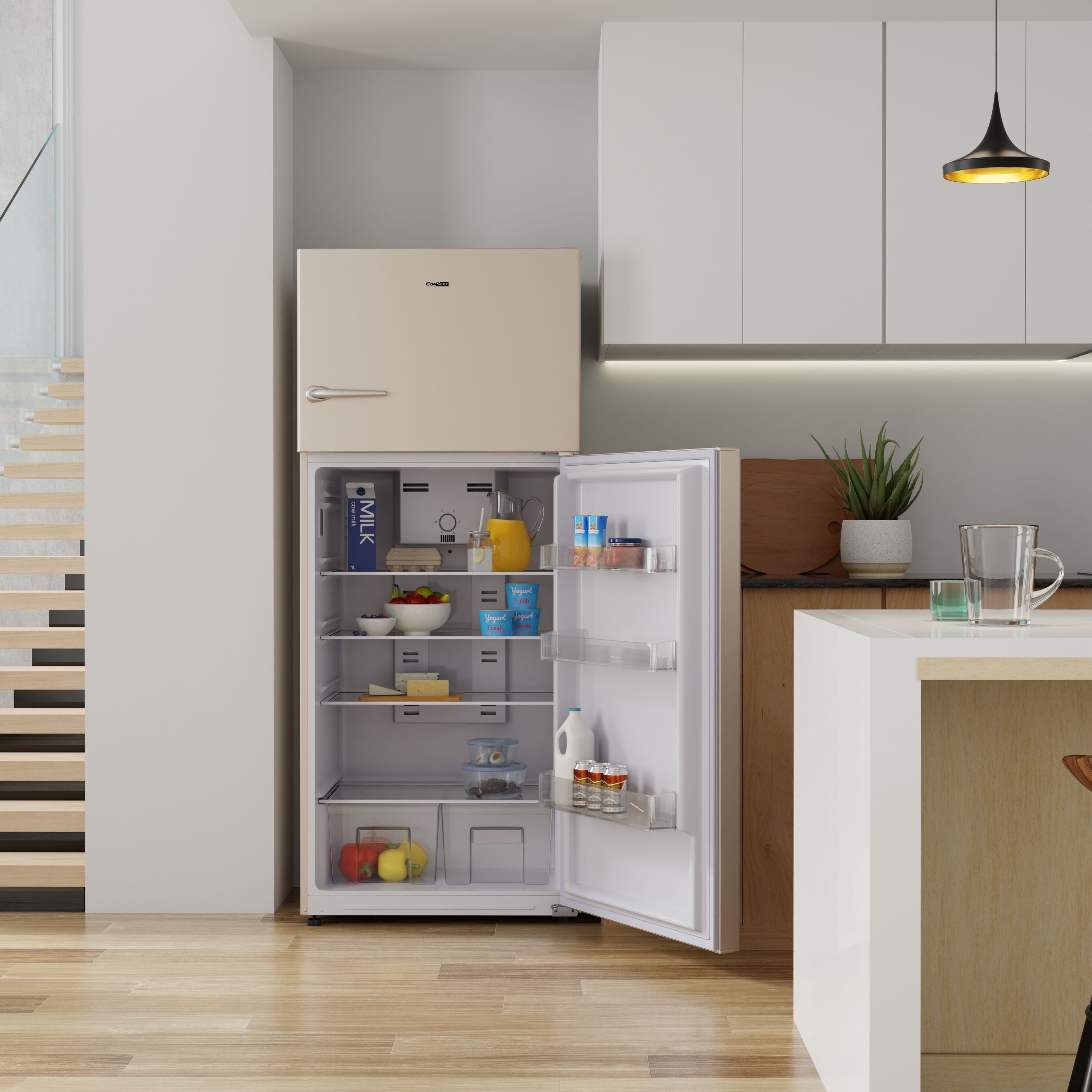 Enjoy vintage style equipped with top-tier features with the ConServ Retro Refrigerator-Freezer with Ice Maker. Designed with retro handles for both the freezer and refrigerator, as well as a sleek exterior (available in black or cream), this model easily fits with nearly all decor styles. The freestanding unit has an interior capacity of 18 cubic feet, and measures 71.73 x 29.52 x 28.70 (HxWxD in inches). It comes with adjustable feet, making it effortless to achieve the perfect fit in your space and 2 crispers to keep your produce seperate from other food items. Inside the refrigerator, there are three adjustable glass shelves, multiple bins, and door storage for extra organization. It also has an interior light to illuminate the contents of your fridge day and night. The freezer comes with one shelf, as well as a pre-installed automatic ice maker. Powering the RRFI 18 B/C is an energy efficient compressor. Users also appreciate the frost free feature, as well as the easy-to-use electronic temperature control.