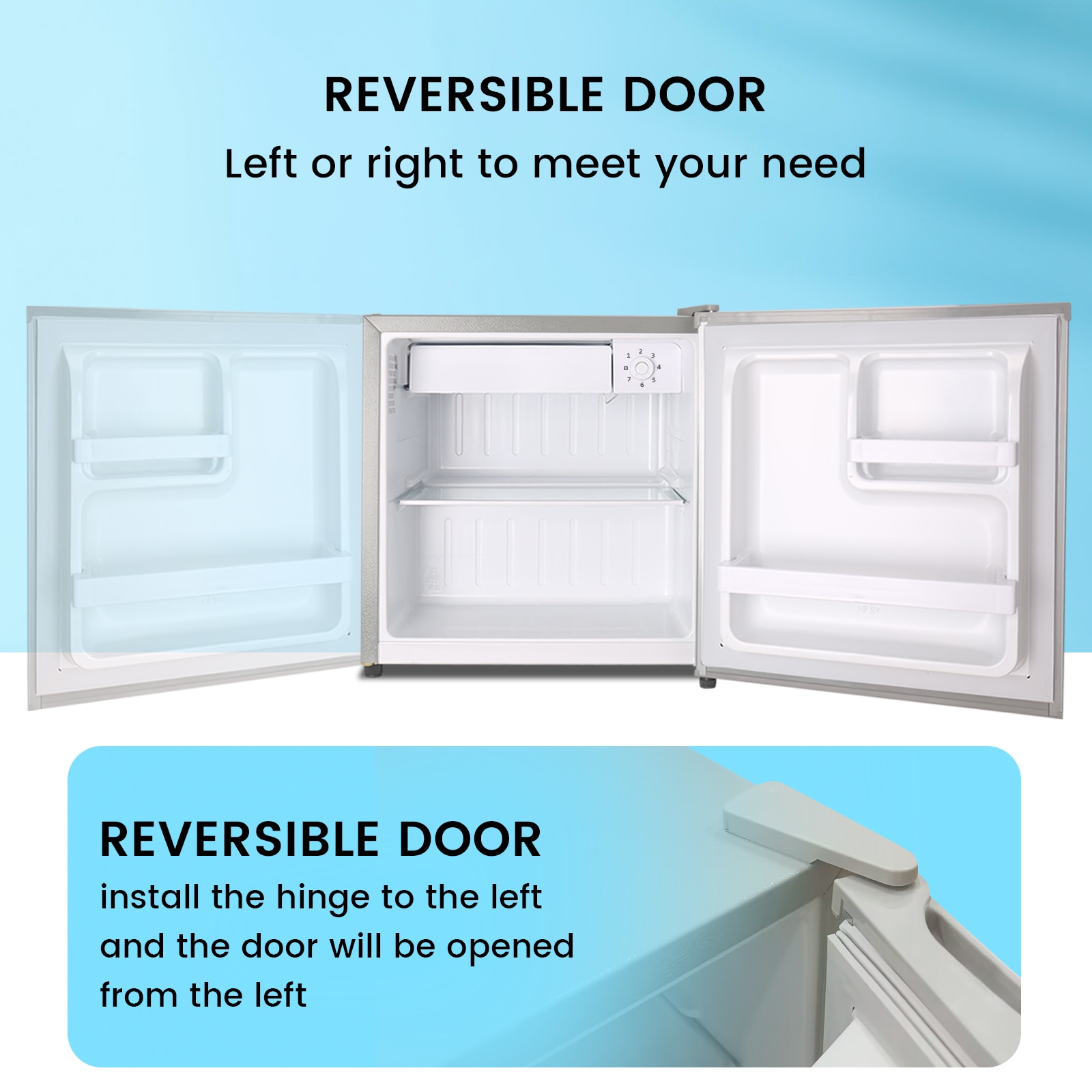 Reversible Door & Adjustable Legs: The compact mini fridge comes with adjustable leveling legs to balance the unit on an uneven surface, offers much convenience to storage, and the reversible door allows you to access it from either of the left or right side