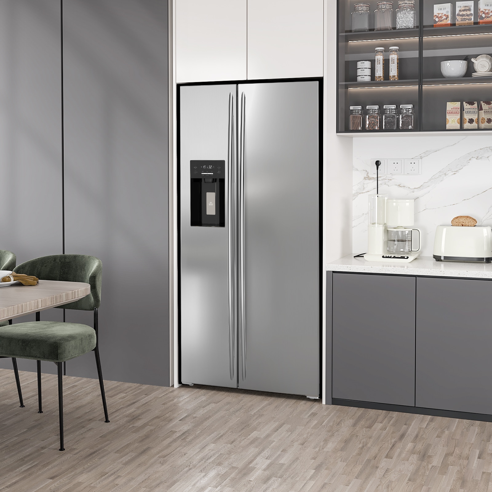 COWSAR 20 CU.FT. 2-in-1 side by side refrigerator with ice maker, with its remarkable performance in large capacity, multi-functionality and intelligence, will bring you a more convenient and comfortable life experience. Boasting a fresh food capacity of 13.48 cu. ft. and a freezer capacity of 6.53 cu. ft., it offers ample space with efficient organization. The fresh food compartment includes 4 spill-proof glass shelves, 2 plastic bins, and 4 door racks, while the freezer features 3 spill-proof glass shelves, 2 storage drawers, and 2 door bins. Besides that, it includes a ice storage box and water/ice dispenser. This side by side refrigerator can be used as an ice maker, which can produce 3.3lbs ice cubes/nugget ice cubes per 24 hours. It can be also dispensed cold water. The Effortlessly adjust temperatures with LED touch controls. Fast cool and fast freeze preserve freshness with rapid temperature setting(Max temp 43°F). High-efficiency LED lighting to illuminate every corner. The compressor inverter ensures energy efficiency, quiet operation, and precise temperature control. See-through drawers and door bins enhance organization. Upgrade your kitchen with COWSAR refrigerator– where innovation meets elegance, guaranteeing freshness at your fingertips, expecting it to brighten up your life. Please free standing place the refrigerator in a well-ventilated place, reserve 5-12 inch space around and behind the refrigerator, and do not cover or block the air grille on the rear cover plate of compressor at the back of refrigerator.