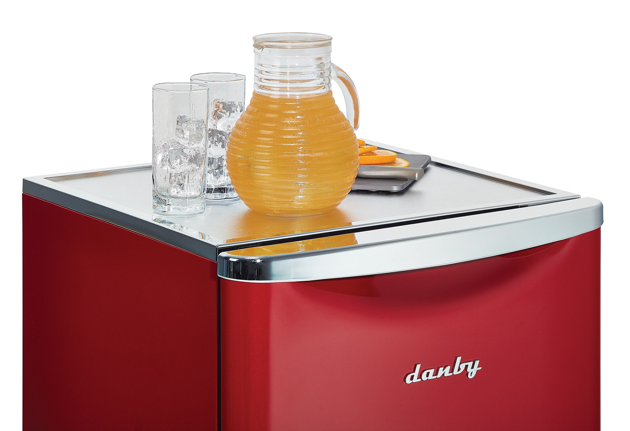 Drawing inspiration from mid century styling and simplicity Danbys patented Contemporary Classic collection of compact refrigerators reimagine retro for the modern consumer. Featuring Danbys exclusive retro inspired curved door design metallic door and chassis finish door lock rubber grip ergonomic chrome handle and stylized chrome worktop its exterior features are only outmatched by its signature black interior. Boasting 4 point 4 Cubic-Feet or 124 liters of storage and cooling space it features two and a half chrome trimmed tempered glass shelves for maximum storage versatility and a vegetable crisper with glass top. There is more than enough room for larger bottles and the spacious unit helps keep electricity bills in check with its Energy Star rating and state of the art mechanical thermostat. Maintenance and cleaning are as simple as can be with the automatic defrost system. It also includes an efficient CanStor beverage dispenser and reliable interior white LED light. This model is built for convenience as the reversible door hinge allows you to adjust it for either left or right handed opening.