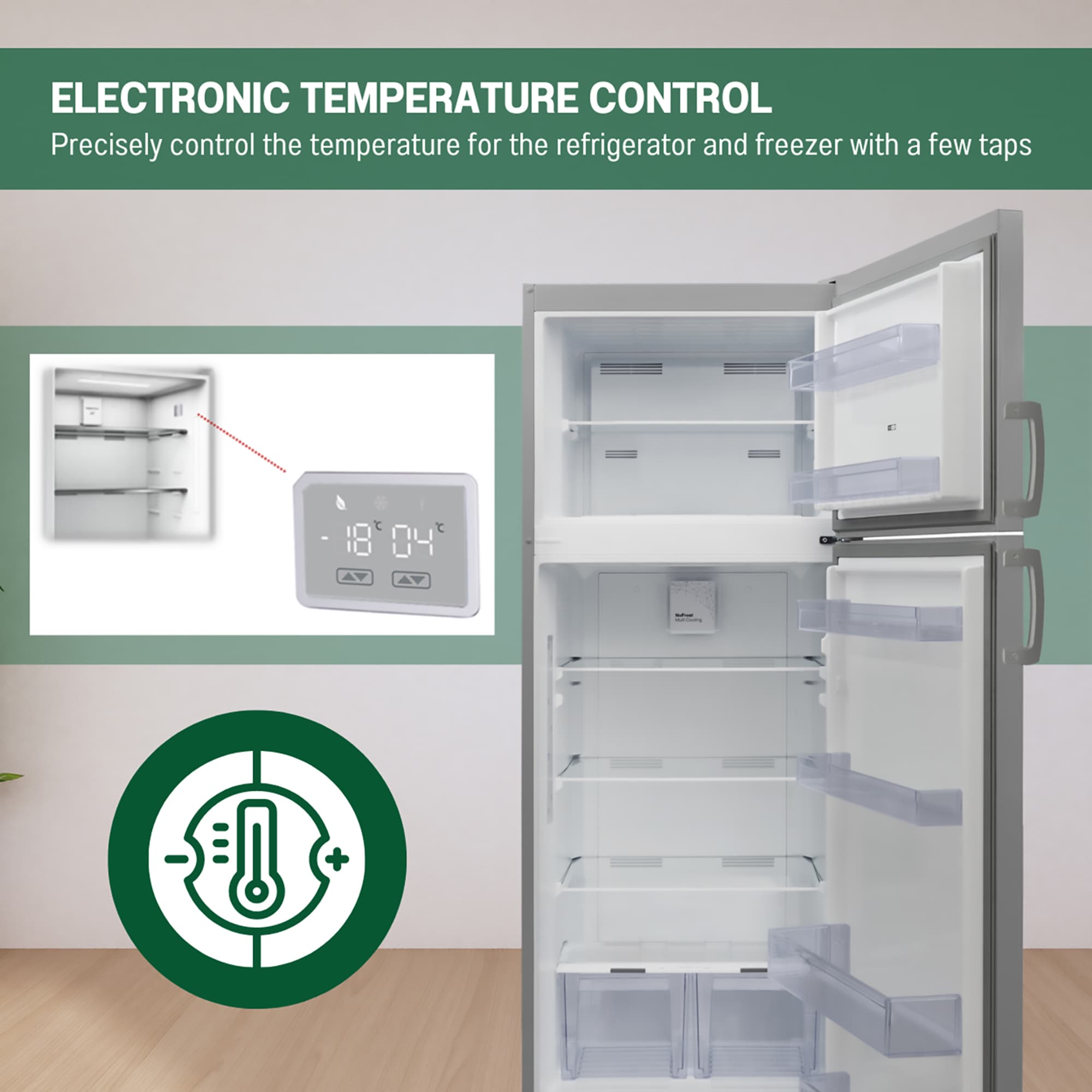 The Equator Top Mounted RF 142 S Refrigerator delivers sleek style and innovative cooling technology, making it an ideal energy-efficient addition to any kitchen. At its core, a new generation compressor cooling system ensures optimal food preservation by blowing dry, cold air that evenly cools and minimizes humidity, across its 10.8 cu. ft. refrigerator and 3.5 cu. ft. freezer compartments. For maximum storage flexibility, the unit features two crisper drawers, 4 adjustable shelves, and a reversible door, allowing for left- or right-handed use. Further enhancing convenience are four refrigerator door shelves, including a 2-liter gallon-sized rack, one glass freezer shelf, and two freezer door shelves. Measuring 68.1 inches in height, 27.5 inches in width, and 28.3 inches in depth, this appliance is equipped with adjustable feet for easy leveling to ensure a perfect fit in any space. Operating on 110V/60Hz/1.84A with R600a refrigerant, this 14.3 cu. ft. capacity appliance comes with Equator’s one-year parts and labor warranty.