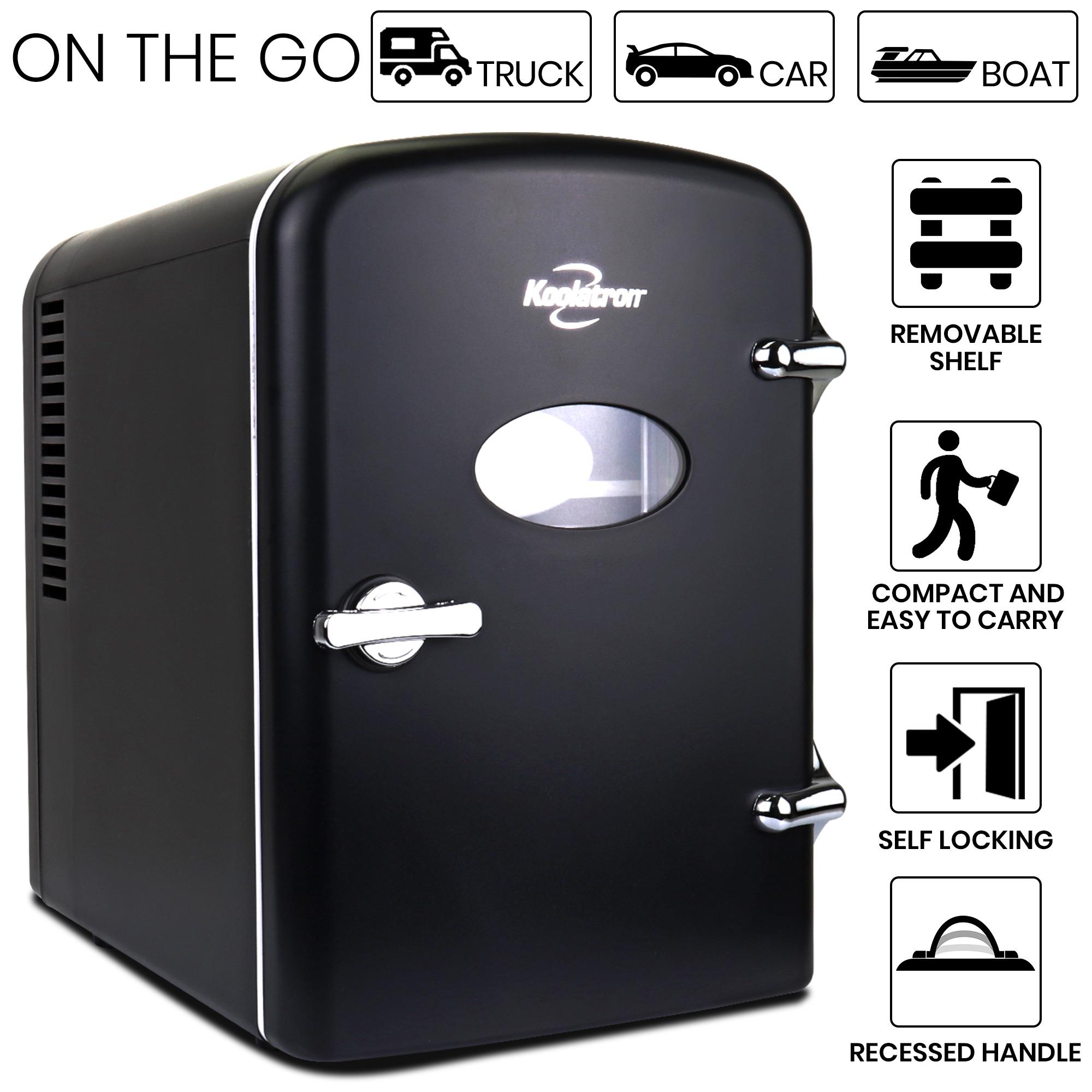 This matte black portable cooler with retro refrigerator design and chrome accents holds up to six standard soda cans and adds vintage charm to any home or dorm. Efficient thermoelectric cooling technology and AC and DC adapters mean you can keep your favorite drinks cold or safely store items such as yogurt, cheese, milk, cosmetics, and infant formula whether you’re at home or on the go.