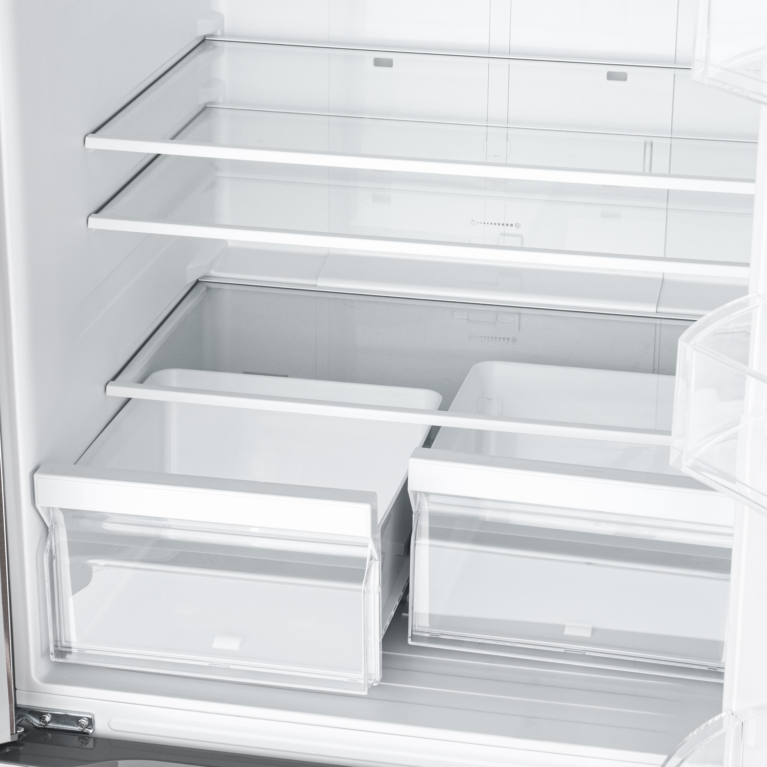 The Koolmore Counter-Depth 18.5 cu. ft. French Door Refrigerator is designed to fit every need in the kitchen. It not only offers a sleek design that fits your home but also all the storage space and little extras you need to support your family. From energy efficiency to temperature and humidity control to expanded freezer space, it’s sure to fill every need from top to bottom. Along with a sleek Stainless-Steel exterior, each Koolmore refrigerator features beautiful see-through shelving on the inside to enhance the look and make it easier to clean. This premium French door fridge with transparent door rack also includes 6 door bins and is designed with two separate large freezer drawers which can store everyday items in the top or deep freezer items in the bottom. The dual crispers also feature humidity control in the produce drawers, which can keep fruits and vegetables, fresher for longer than standard drawers. Each fridge also features heavy-duty feet at the bottom that make it easier to find optimal balance which is important for keeping items from sliding around on shelves. Our tall and spacious yet more compact stainless-steel refrigerator boasts a smooth, elegant design with premium pull handles to make it easier to get into each space with seamless effort.