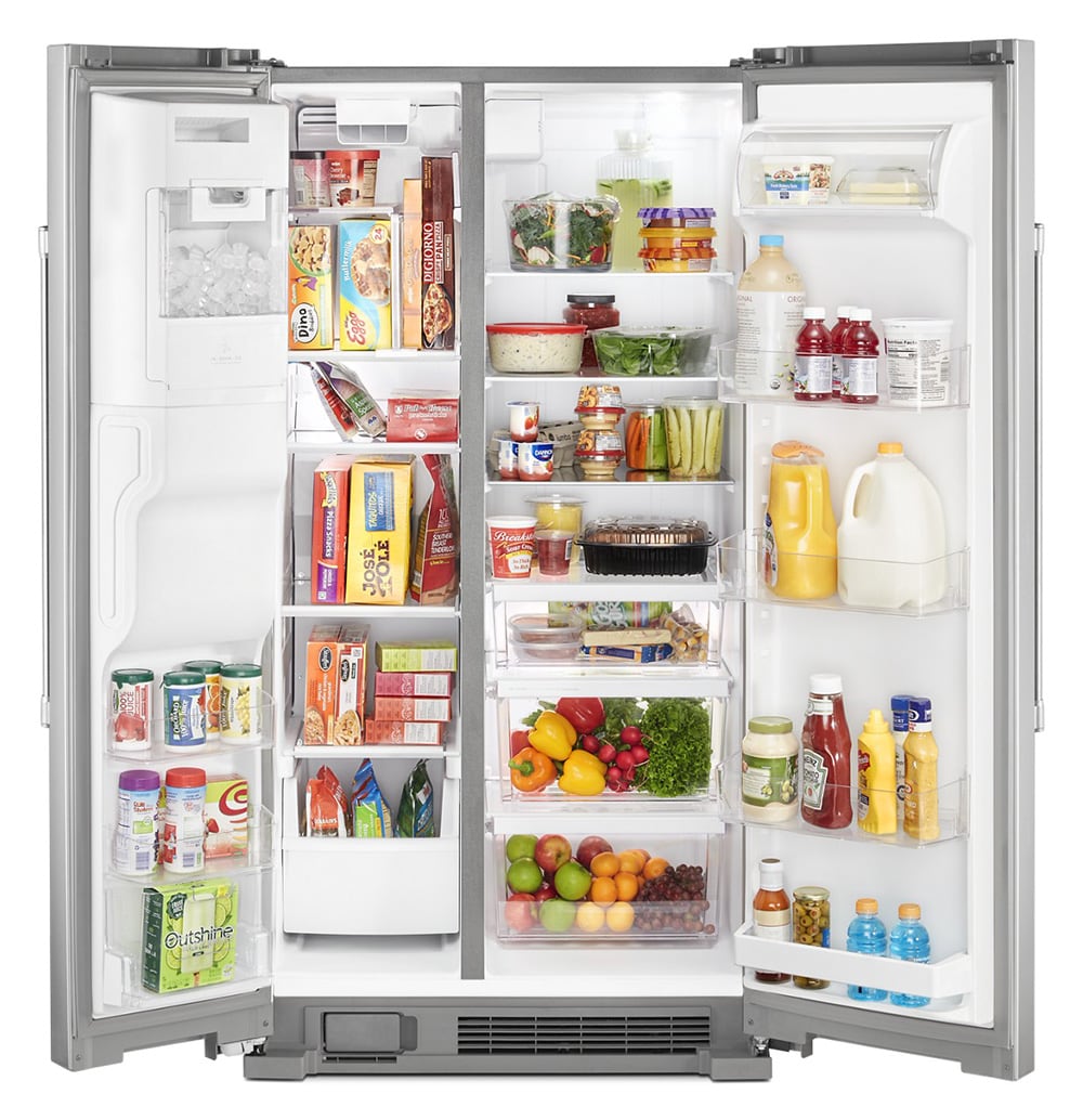 This side-by-side refrigerator is built tough and easy-to-clean with its fingerprint resistant stainless steel finish. Built with plenty of storage options, including a specially designed soft freeze bin that puts you in control of the way foods freeze. Put in a pint of ice cream and it’s soft enough to scoop. Frozen pizza storage stores two frozen pizza boxes upright and out of the way, so quick meals are an easy grab. The distinct and durable Signature Maytag® metal shelf adds a bold look to the inside. With an exterior ice and water dispenser for easy access, plus a 10-year limited parts warranty on the compressor, this side-by-side fridge will keep it all cool for years and years.