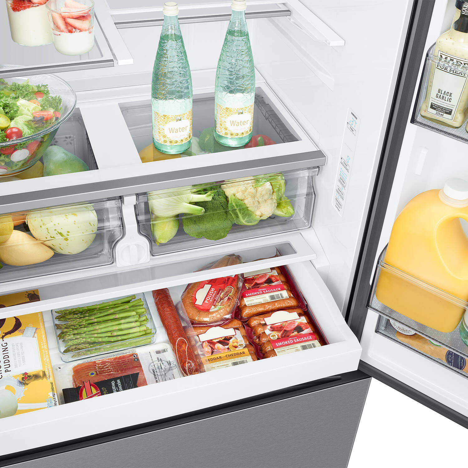 Samsung’s 26 cu. ft. Mega Capacity Counter Depth, 3-Door French Door refrigerator has a modern design to blend seamlessly into your kitchen. Get extra space to store more groceries, including big and bulky items. Plus, get easy access to chilled, filtered water and curved or crushed ice with the external water and ice dispenser.