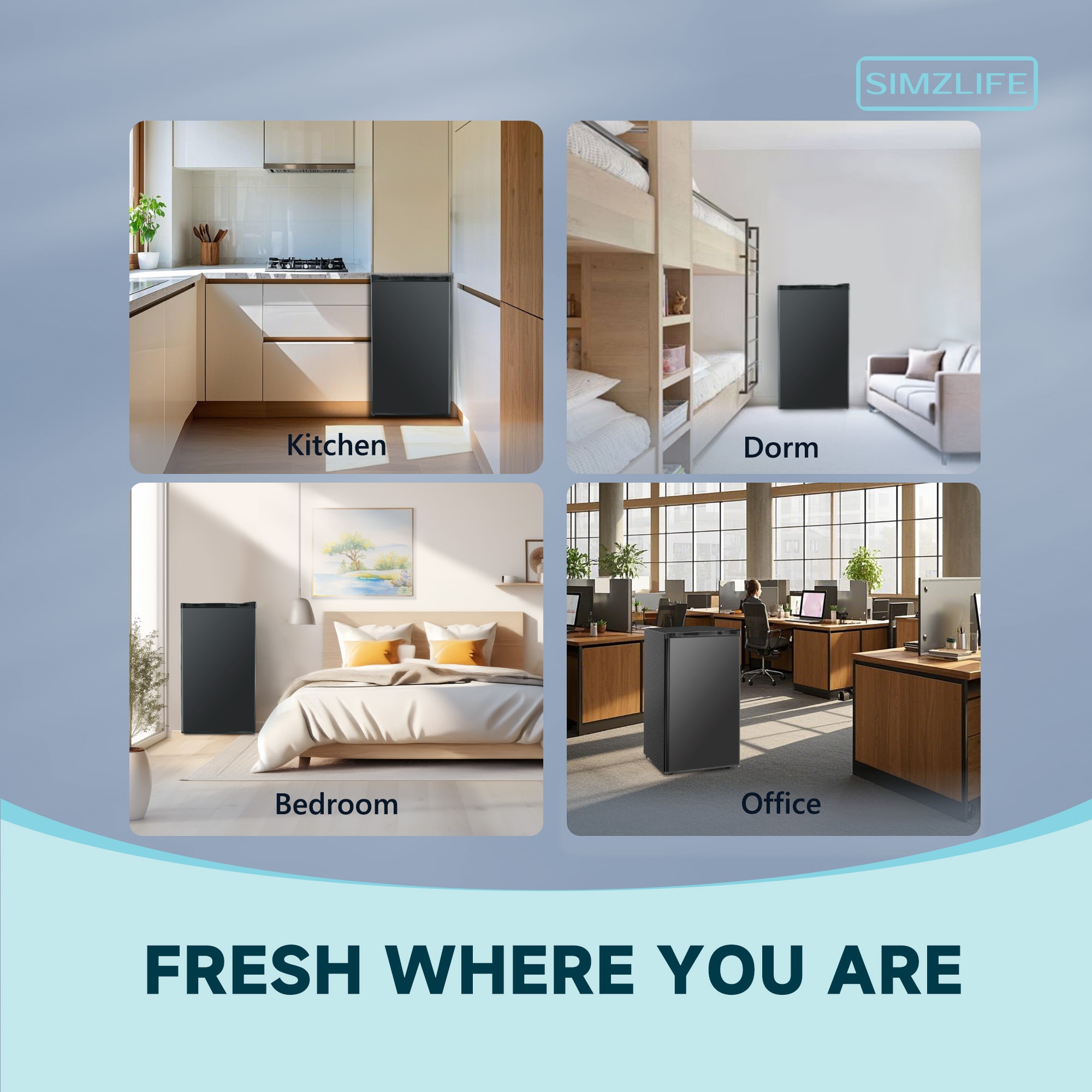Our mini refrigerator, energy-saving and environmentally friendly, providing you with an efficient cold storage experience. Uniquely user-friendly design with LED light allows you to access it anytime at night with no restrictions. Featuring a large capacity of 3.2 cu. ft. including 2.9 cu. ft. refrigeration section and 0.3 cu. ft. micro-freezing section, it meets your various storage needs. Compact design for bedrooms, kitchens, dormitories and offices with a small footprint of only 2.2 square feet. Quiet operation, only 38dB, five-position temperature control knob, precise temperature adjustment, thoughtful details reflect quality.Our professional after-sales team is at your service 24 hours a day, and the product is fully equipped, so you can enjoy a convenient refrigeration experience.