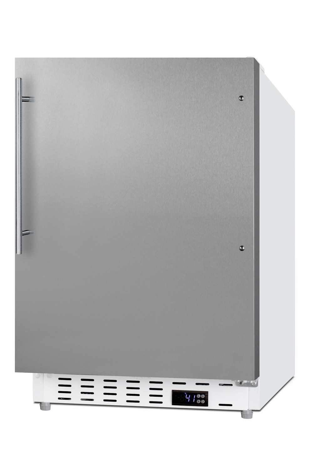 Summit Appliance offers a quality selection of 21″ wide built-in undercounter all-refrigerators designed for installation under lower ADA compliant counters, with advanced features for user convenience.The ALR46WSSHV is sized at 32″ high to fit under lower counters complying with ADA guidelines for accessibility. The fully finished textured white cabinet allows freestanding use, while the front-breathing system means this unit can be built-in with minimum clearance. The user-reversible, stainless steel door is 3″ thick for efficient insulation, with a sleek vertical handle with a thin 14mm diameter, a popular style that matches many common cabinet handles. This unit comes with a right angle cord to allow for easier placement without added depth. A digital thermostat, located in the kickplate, makes for easy temperature management with a readout in Fahrenheit or Celsius. Inside, the ALR46WSSHV features an all-white interior for easy cleaning and viewing of contents. An LED light located toward the front of the unit attractively illuminates the interior when the door opens. Automatic defrost operation ensures minimal user maintenance, with an internal fan to help ensure even cooling throughout the 3.53 cu.ft. interior. Three adjustable glass shelves offer optimal storage options for large and small items, while a pull-out crisper drawer provides storage for fruits and vegetables. Three removable door racks accommodate additional storage as needed. The user-set high and low-temperature alarms provide added security should the temperature go beyond the setpoint, while the open door alarm sounds if the door is ajar over one minute for added peace-of-mind. These alarms can be disabled depending on your needs. Sized at just 21″ wide, the ALR46WSSHV is the perfect addition for space-challenged environments seeking dependable freezer options in a durable design.