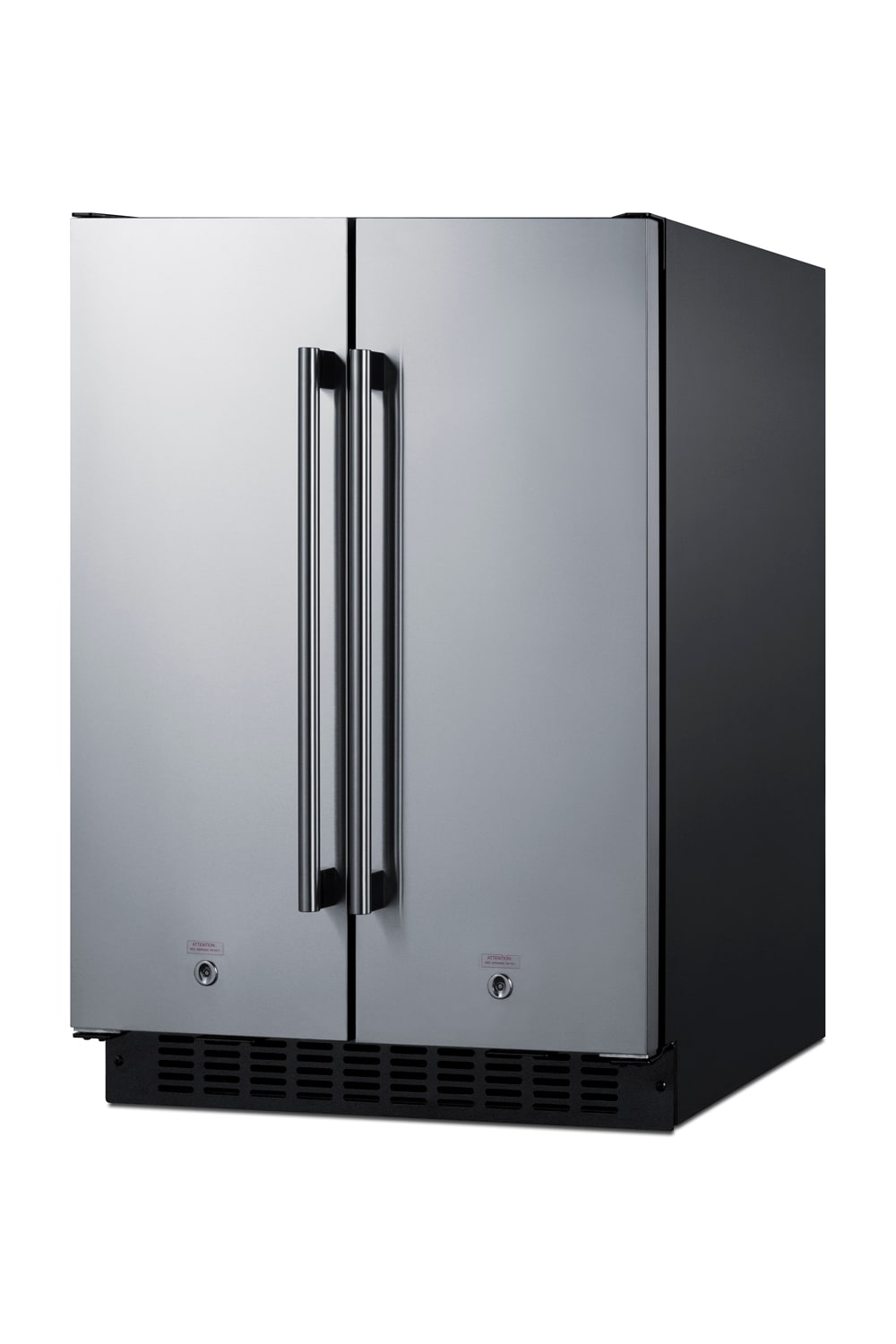 SUMMIT brings quality and value under the counter with a large collection of built-in refrigeration. Sized at 24″ wide, the FFRF24SS is an all-in-one side-by-side refrigerator-freezer. The front breathing design allows built-in installation under counters, while the fully finished black cabinet also enables freestanding use. This unit features stainless steel wrapped doors with a horizontal grain and pro style handles. Each compartment has a factory installed front lock for added security. The sealed rear and right angle plug offer a better fit.Inside, the FFRF24SS features a frost-free freezer compartment on the left and a frost-free refrigerator compartment on the right. The refrigerator includes a digital thermostat allowing users to manage the temperature in each compartment, with a readout in Celsius or Fahrenheit for added convenience. Adjustable glass shelves offer cleaner spill-proof storage for fresh food items, while two removable door shelves provide additional storage space as needed. An internal fan assures the compartment is cooled evenly from top to bottom. The freezer compartment includes adjustable wire shelves to ensure proper cold air circulation. Both sides feature LED lighting to provide an attractive, energy efficient presentation. The slotted floor design is ideal for keeping bottles safely in place. Additional features include an open door alarm, high temperature alarm, and Sabbath mode setting that allows you to disable certain functions during religious observance. With its innovative all-in-one design, user-friendly features, and full frost-free operation, the FFRF24SS is a great choice for smaller kitchens looking to maximize storage space under the counter.