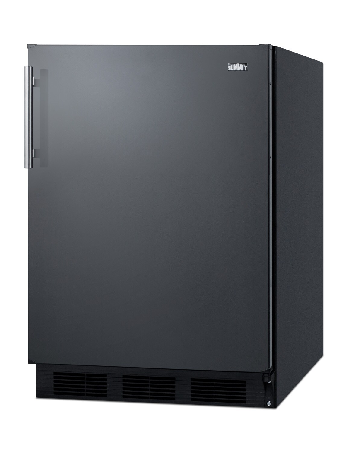 SUMMIT offers a large selection of counter height refrigeration, with a range of choices to best suit any kitchen. The FF63B Series includes European made all-refrigerators designed for freestanding use in residential settings.Sized with a 24″ footprint, the FF63BK all-refrigerator is designed for recessed installation or freestanding use. It comes in a classic black finish with a user-reversible door swing and attractive stainless steel handle.Inside, the FF63BK utilizes automatic defrost operation to ensure minimum user maintenance. The 5.5 cu.ft. interior offers more storage space than most models in this size class. Adjustable glass shelves ensure spill-proof storage, while a large crisper drawer is ideal for keeping produce at its best. A removable wine shelf lets you keep bottles securely in place. The door includes three storage racks for condiments and tall bottles. The seamless interior also features a dial thermostat and automatic light. Designed and constructed in Europe, the FF63BK brings reliable cold storage to any home setting.
