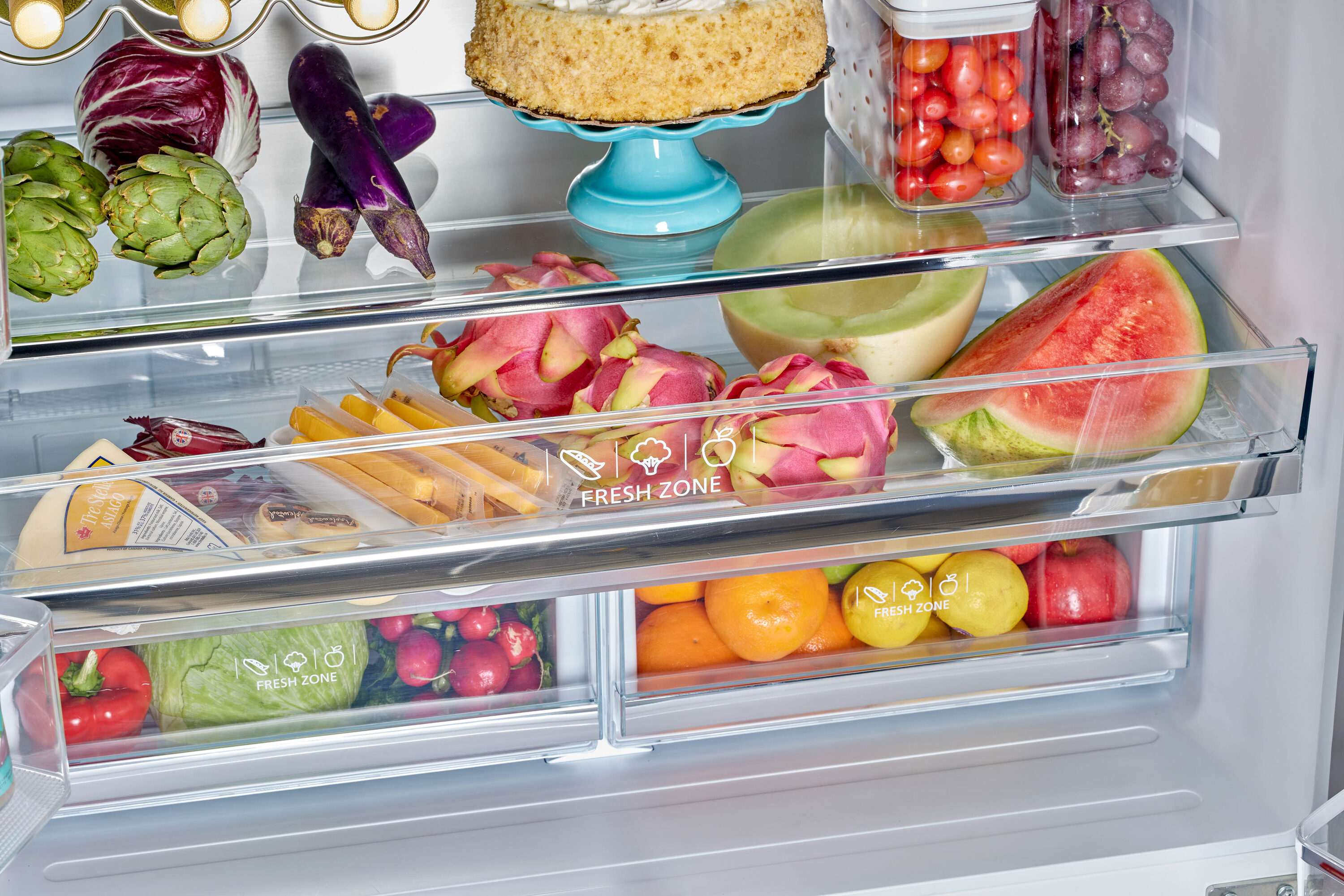 The 21.4 cu. ft. French door refrigerator, a stylish and energy-efficient addition to your kitchen. This refrigerator not only boasts a generous storage capacity but is also Energy Star certified. Say goodbye to tedious defrosting with its frost-free design, allowing you to enjoy a hassle-free experience while maintaining the freshness of your groceries. The family-sized design prioritizes convenience with adjustable shelves and ample door storage, accommodating the diverse needs of a busy household.