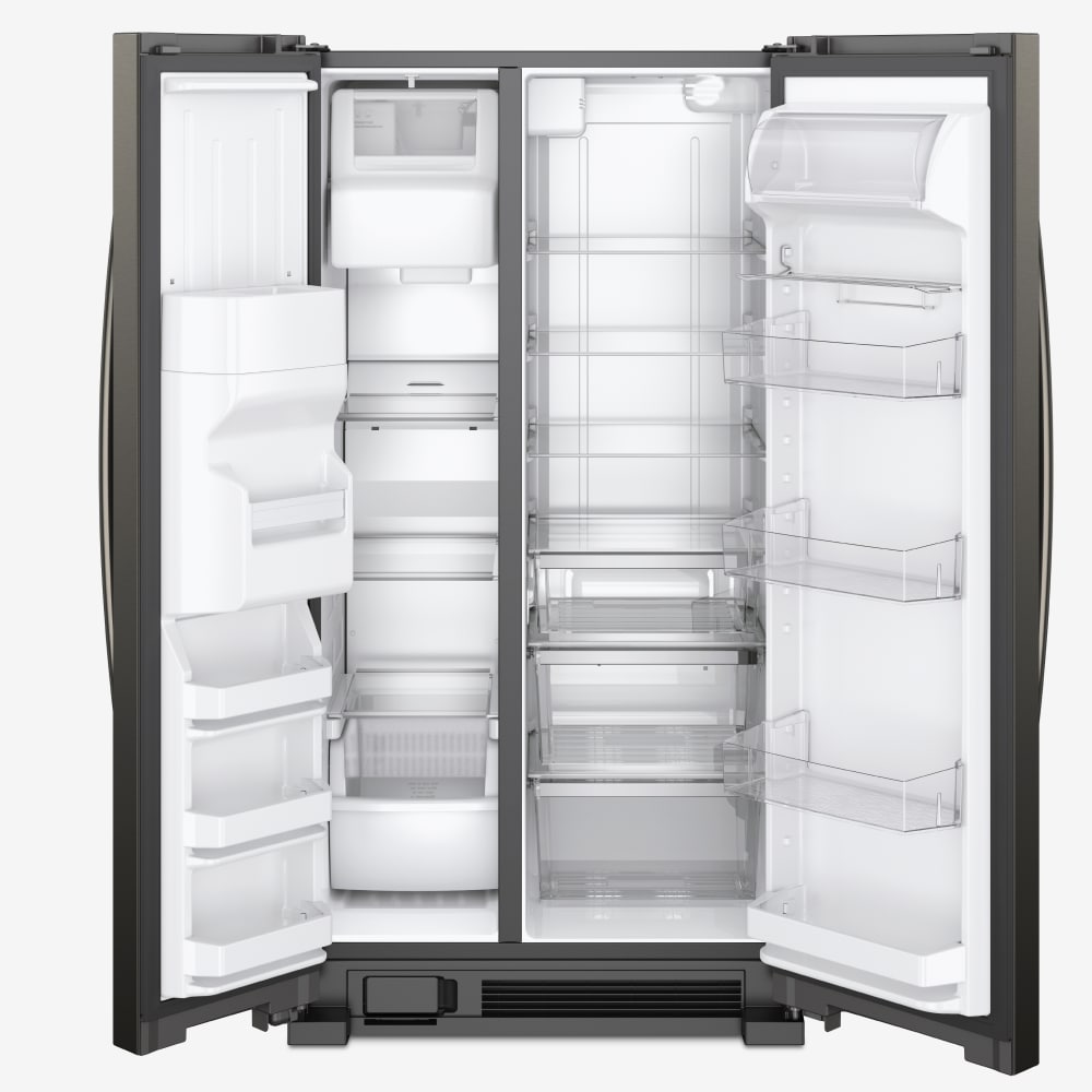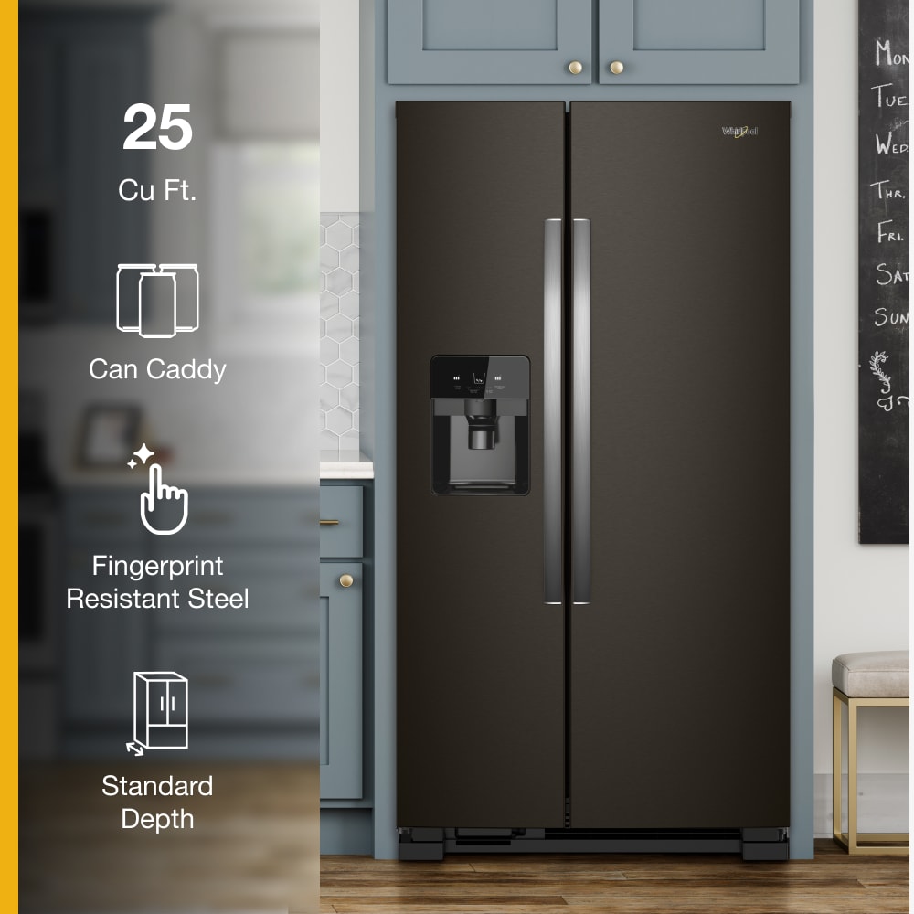 Enjoy purposefully designed storage spaces for the items your family uses the most. This Whirlpool® 25 cu. ft. Side-By-Side Refrigerator is designed with features to help you fit and find your favorite foods, like an in-door Can Caddy, Frameless Glass Shelves that offer greater storage flexibility and a Deli Drawer. This model also allows access to fresh filtered water and ice without ever opening the refrigerator door. Whirlpool® Side-by-Side Refrigerators have the lowest repair rate among side-by-side refrigerators. (*Claim compares Whirlpool branded refrigerators to GE, Frigidaire, Samsung and LG.Based on service required data, Q2 2022-Q2 2023, Traqline – The Stevenson Company, 2023.)