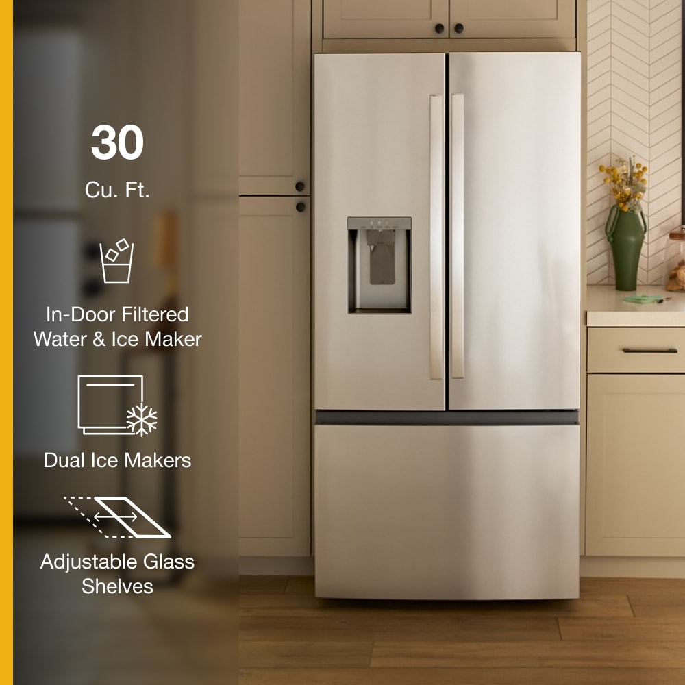 Get family-sized capacity, ice and flexible organization to keep up with whatever the day brings. This Whirlpool® French Door Refrigerator makes over 3 lbs of ice every day. Fill up quick with the In-Door Filtered Water Dispenser & Ice Maker. Pint-Size Storage provides easy access to small items. And enjoy flexible storage with half and full Adjustable Glass Shelves. ENERGY STAR® certified.