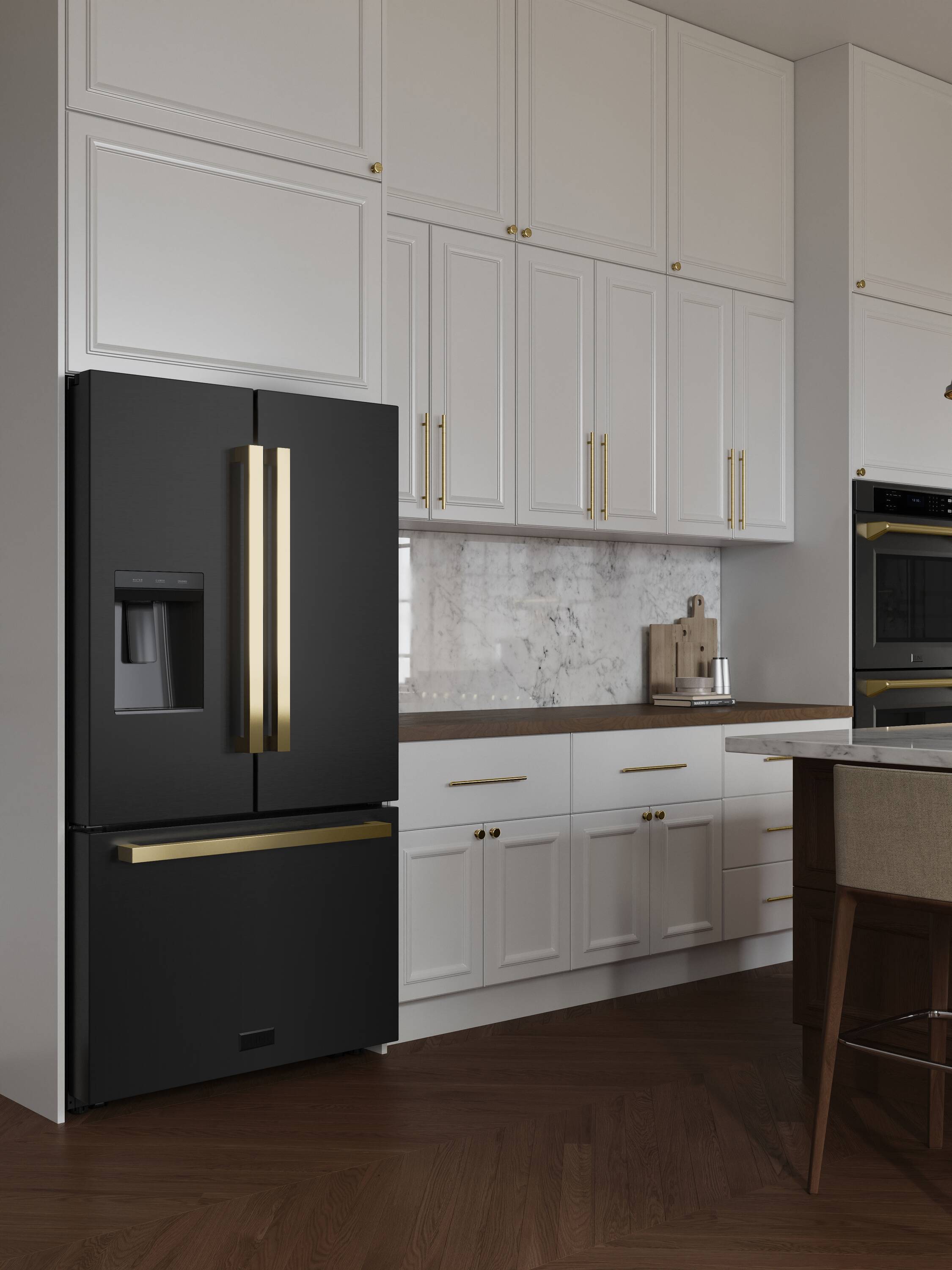 Luxury isn’t meant to be desired — it’s meant to be attainable. The ZLINE Autograph Edition 36 in. 28.9 cu. ft. Standard-Depth French Door External Water Dispenser Refrigerator with Dual Ice Maker in Fingerprint-Resistant Black Stainless Steel and Polished Gold Modern Handles (RSMZ-W-36-BS-FG) features a state-of-the-art cooling system, a professional built-in water and ice dispenser, and an expansive interior designed to store more items than ever before. With an elevated level of luxurious design, ZLINE Autograph Edition Standard-Depth Refrigerators are masterfully crafted to preserve more space for what matters.