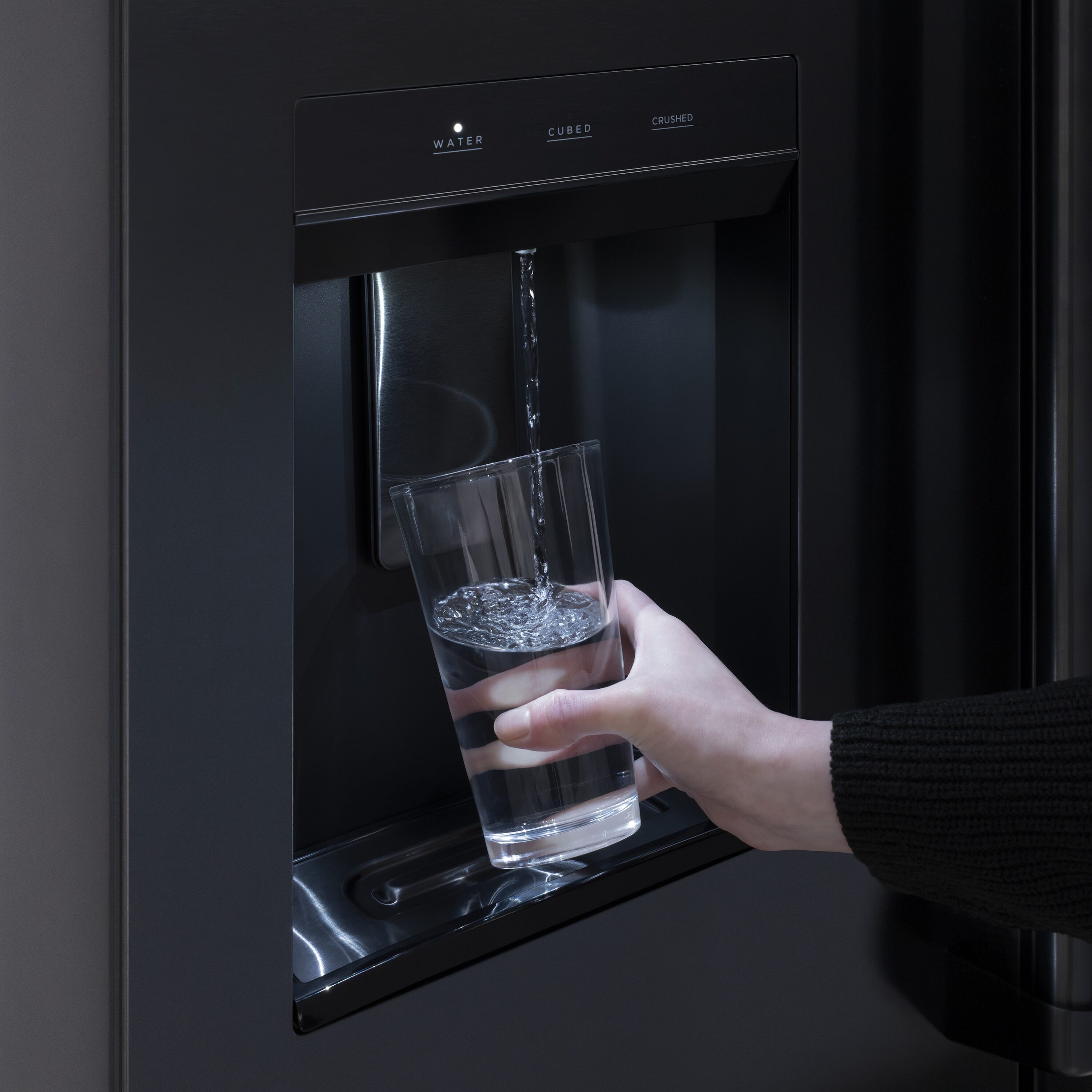 External Water and Ice Dispenser – Deliver fresh filtered water and crushed or cubed ice from a sleek in-door dispenser that fits containers up to 10 in tall; a simple-to-replace water filter is located at the bottom of the refrigerator compartment to accommodate ADA access